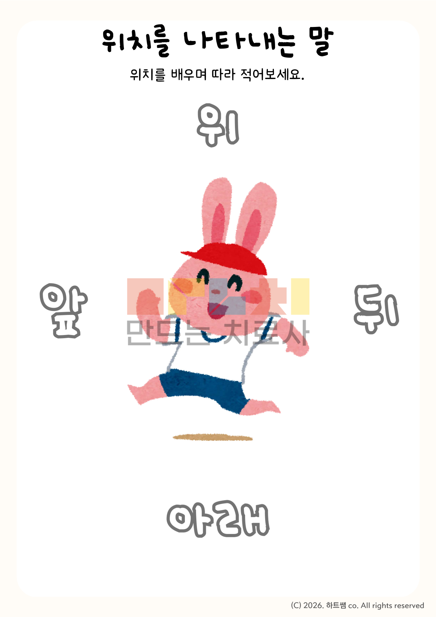 위치 이해하기 1탄 활동지는 6가지 활동지로로 구성되어 있으며, 즐겁게 활동하며 어휘 확장, 시각 주의집중, 시각정보를 기억하고 확장할 수 있는 활동으로 구성되어 있어요. 목표: 어휘 확장, 시각 주의집중, 시각정보 기억 및 확장, 알맞은 위치 이해하기 6가지 위치 개념을 이해할 수 있는 활동지로 구성되어 있습니다. 다양한 활동지를 선생님과 함께 풀어보며 위치에 대해 이야기를 나누고, 위치를 찾고 익히는 과정에서 어휘를 확장하고 시각적 주의집중과 위치 이해 능력을 향상시킬 수 있습니다. 활동지는 총 33P, PDF(A4 사이즈) 표지 1장, 활동지27장, 정답지 5장입니다.:D 2차 수정 및 무단 공유는 불가합니다. 다운로드 후 인쇄 시 사진이 깨지고 파일이 작은 경우 메일로 연락주세요.(파일을 다시 보내드립니다.) 오류, 수정사항은 메일로 연락주세요. 수정 후 파일을 다시 보내드리겠습니다 :D (som-1221@nate.com)