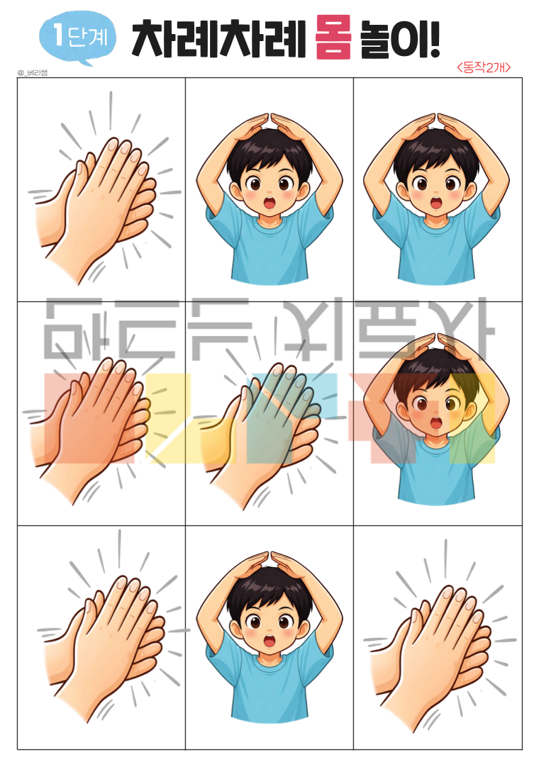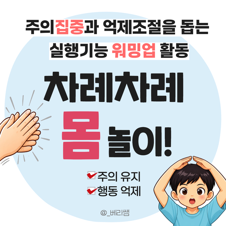 🧠 차례차례 몸놀이 보고, 기억하고, 순서대로 움직여요! 차례차례 몸놀이는 다양한 신체 동작을 따라 하며 주의집중, 행동 억제, 실행기능을 자연스럽게 연습할 수 있는 활동입니다. 수업 전 집중력 워밍업 활동으로 활용하기 좋으며 아이들이 즐겁게 참여하며 규칙 이해와 자기조절 능력을 기를 수 있습니다. ✔ 추천 대상 • 주의집중이 어려운 학령전·학령기 아동 • 충동 조절이 어려운 ADHD 성향 아동 • 규칙 이해와 실행이 어려운 경계선 지능 및 느린 학습자 • 실행기능 및 자기조절 훈련이 필요한 아동 • 수업 전 집중력 워밍업 활동이 필요한 아동 ✔ 기대효과 • 주의집중력 향상 제시된 동작을 관찰하고 순서에 맞게 수행하며 집중력을 기릅니다. • 행동 억제 능력 발달 금지된 동작을 하지 않도록 조절하며 충동 억제 능력을 연습합니다. • 실행기능 발달 규칙을 기억하고 적절한 행동을 선택하며 실행기능을 강화합니다. • 작업기억 강화 동작 순서를 기억하고 수행하며 작업기억 능력을 기릅니다. • 신체 협응 능력 향상 다양한 신체 동작을 수행하며 몸의 협응과 반응 조절 능력을 키웁니다.