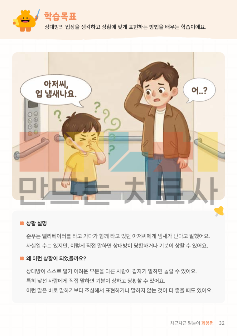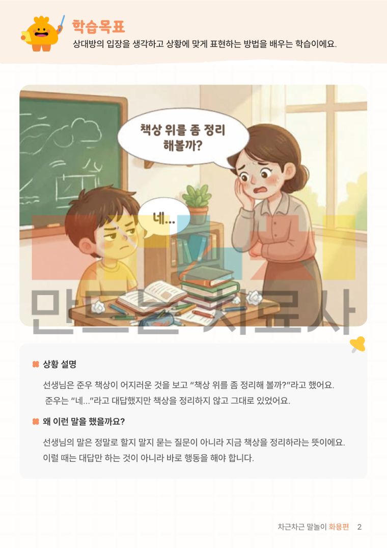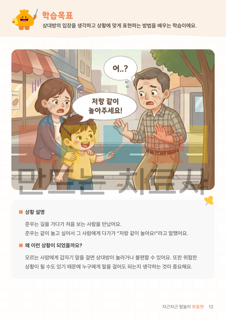 차근차근 말놀이 화용편은 일상에서 일어나는 다양한 상황을 통해 상대방의 마음을 생각하고 상황에 맞게 말하고 행동하는 방법을 차근차근 익히는 화용 언어 학습지입니다.
