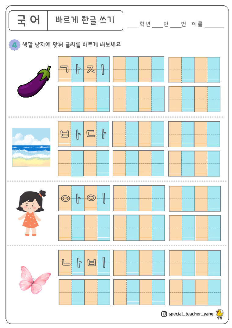 ★ 깍두기 공책에 맞춰 바르게 글씨를 쓰는 활동 연습을 위한 활동지입니다. ★ 자모음이 서로 다른 칸으로 표시되어 바르게 글씨를 쓰도록 도움을 줍니다. ★단모음으로 구성되어 있습니다.