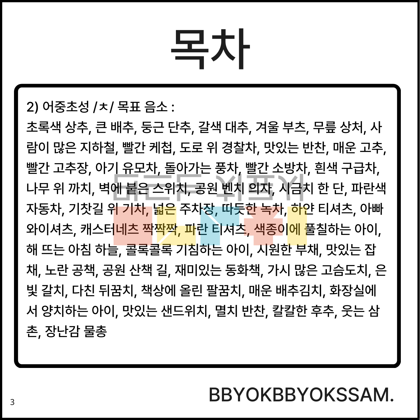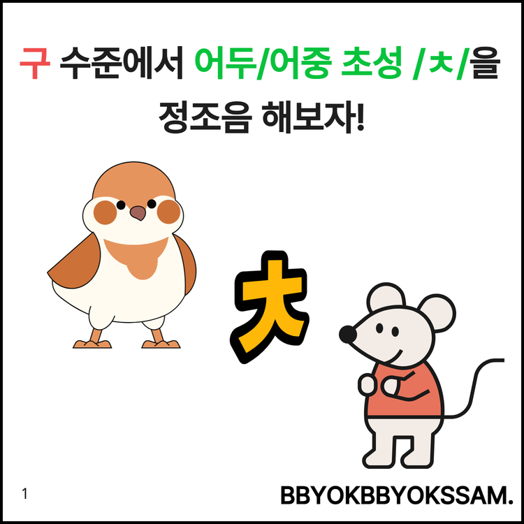 구 수준에서 어두/어중초성 /ㅊ/을 정조음 하는 것으로 구성되어 있습니다. 한 페이지에 4컷으로 구성되어 있으며, 마지막 페이지는 3컷 그림이 있습니다. 어두초성 /ㅊ/은 11페이지(10페이지는 4개의 그림, 11페이지는 3개의 그림), 어중초성 /ㅊ/은 12페이지(11페이지는 4개의 그림, 12페이지는 3개의 그림)으로 구성되어 있습니다.