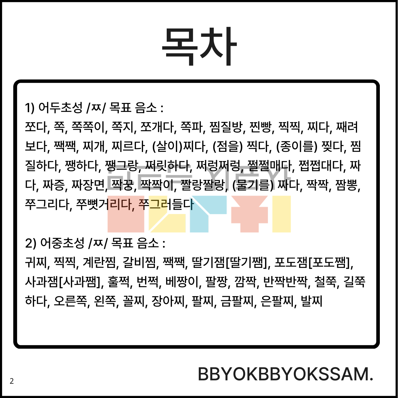단어 수준에서 어두/어중초성 /ㅉ/을 정조음 하는 것으로 구성되어 있습니다. 한 페이지에 6컷으로 구성되어 있습니다. 어두초성 /ㅉ/은 6페이지, 어중초성 /ㅉ/은 4페이지로 구성되어 있습니다.