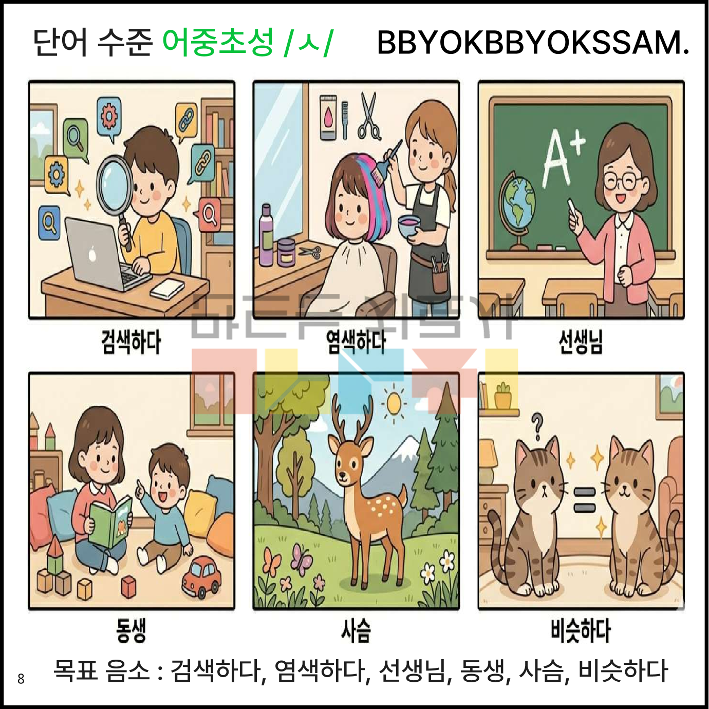 단어 수준에서 어중초성 /ㅅ/을 정조음 하는 것으로 구성되어 있습니다. 한 페이지에 6컷으로 구성되어 있습니다. 어중초성 /ㅅ/은 15페이지(한 페이지 6컷 그림 14페이지, 한 페이지 3컷 그림 1페이지)로 구성되어 있습니다.