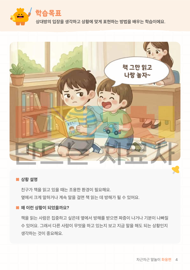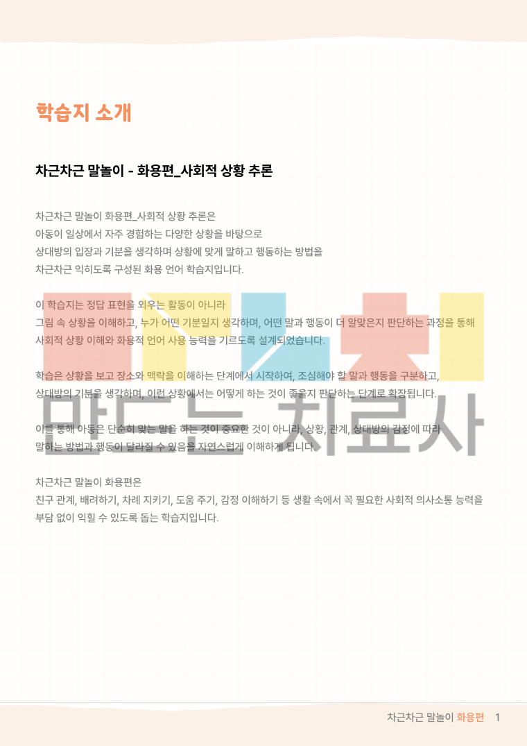 차근차근 말놀이 화용편은 일상에서 일어나는 다양한 상황을 통해 상대방의 마음을 생각하고 상황에 맞게 말하고 행동하는 방법을 차근차근 익히는 화용 언어 학습지입니다.