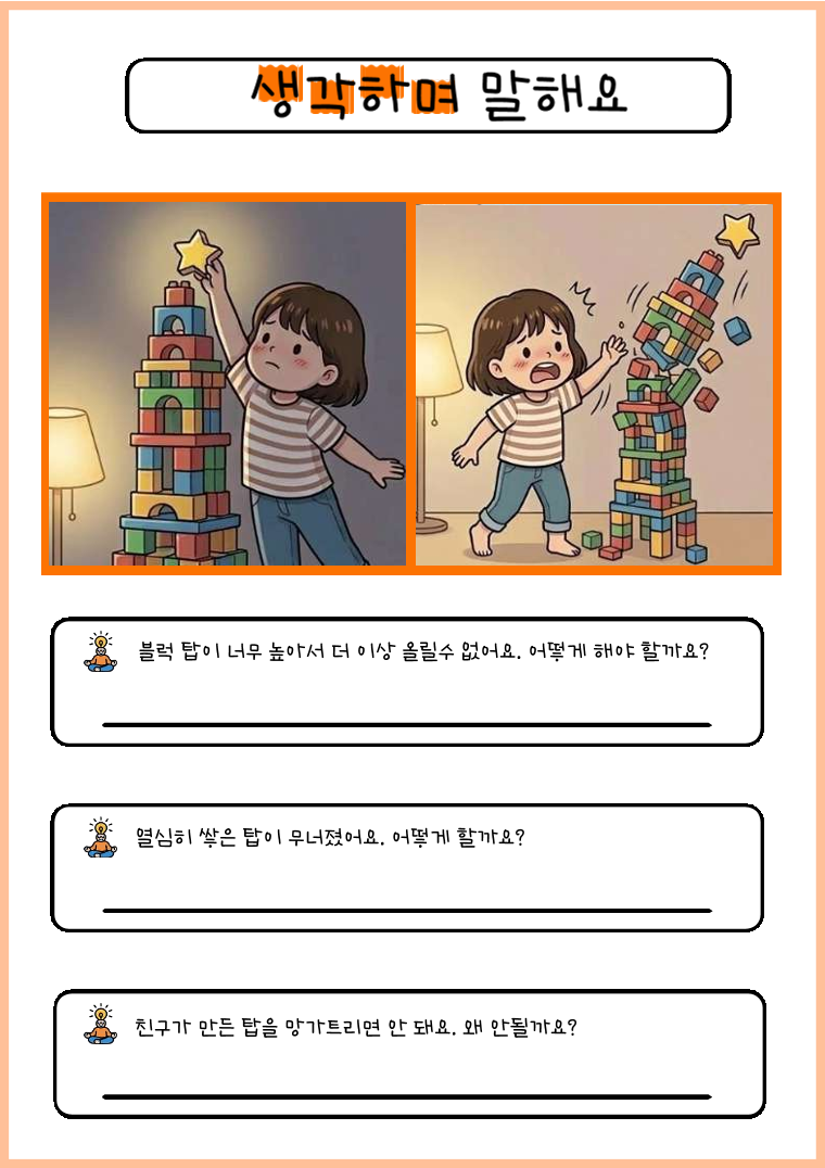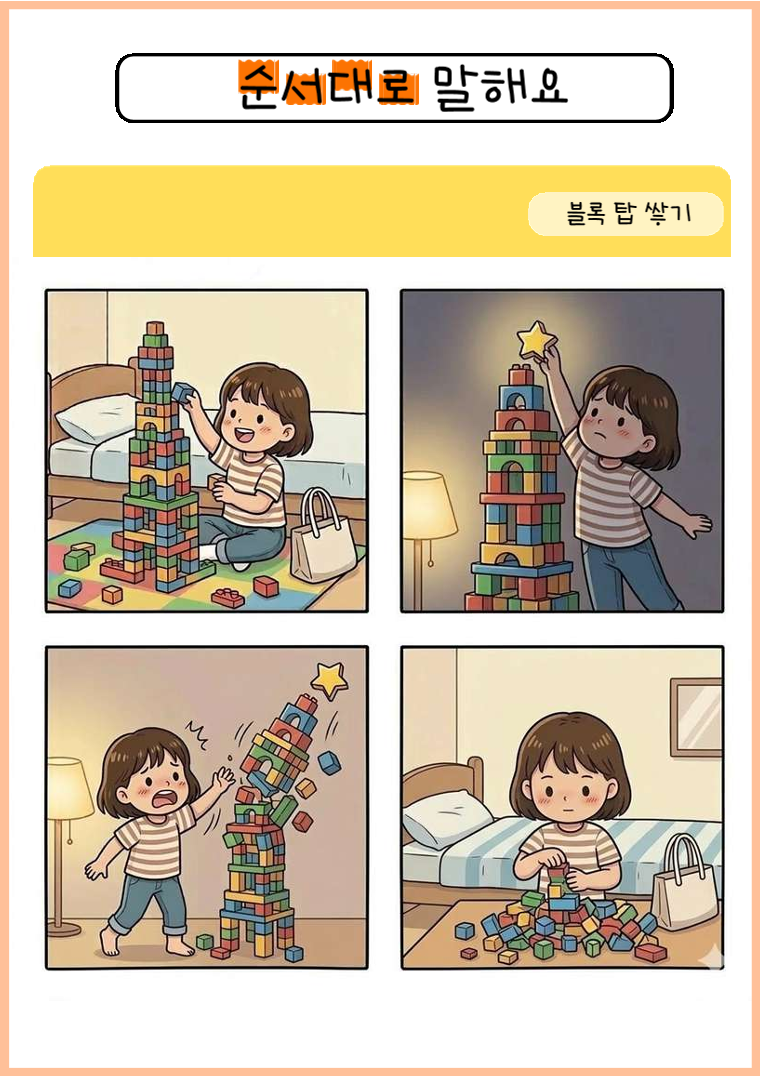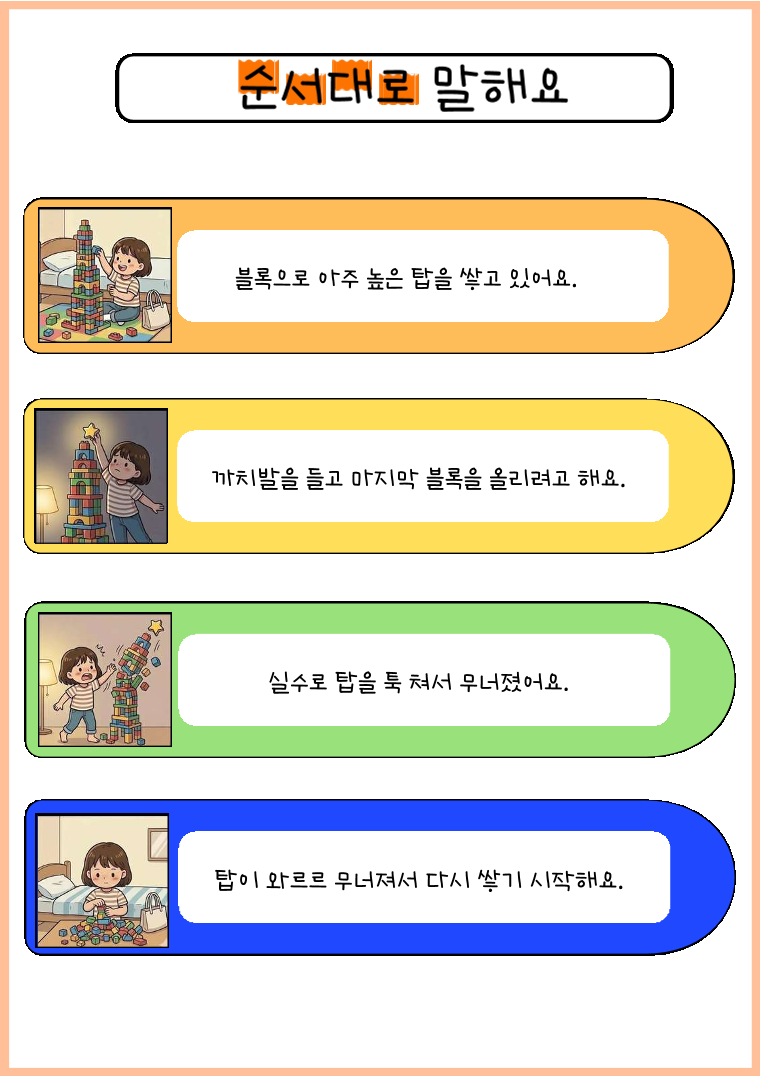 학령전기 아동들에게 친숙한 일상생활과 밀접한 관련이 있는 주제로 4컷 그림 카드를 제작하였습니다. 4장의 카드를 사건의 흐름에 맞게 순서대로 배치하며 논리적 순서를 익히고 상황에 맞는 문장을 만들어볼 수 있습니다. 이 활동을 통해 사건의 인과관계를 추론할 수 있고 '왜', '어떻게'라는 질문을 통해 문제 해결 및 예측하기를 목표로 과제를 수행할 수 있어요. 1. 추천 대상 (만 3세~7세) - 복문 사용 및 일관성 있는 이야기 구성이 힘든 아동 - 문장 표현이 짧아 단문 위주로 말하는 아동 - 상황 판단 및 논리적 인과관계 파악에 어려움이 있는 아동 - 상황에 적절한 사회적 의사소통 및 문제 해결 전략 습득이 필요한 아동 2. 자료 구성 및 특징 - 4컷 이야기 카드(10개 장면) - 이야기 설명 카드 - "생각하며 말해요" 활동지 : '왜', '어떻게' 질문에 답하기를 통한 문제 해결 능력 향상 3. 학습 목표 사건의 순서에 나타난 인과관계를 이해할 수 있습니다. 다어절 문장 산출 및 구문 확장 : 관형사절, 연결어미, 부사를 활용해서 복문 만들기를 유도합니다. 상위언어 및 추론 능력 : 아동의 수준에 따라 의문사 '왜', '어떻게' 질문에 답해볼 수 있습니다. 그림에 직접 나타나지 않은 감정에 대해서 이야기를 나눠볼 수도 있습니다.