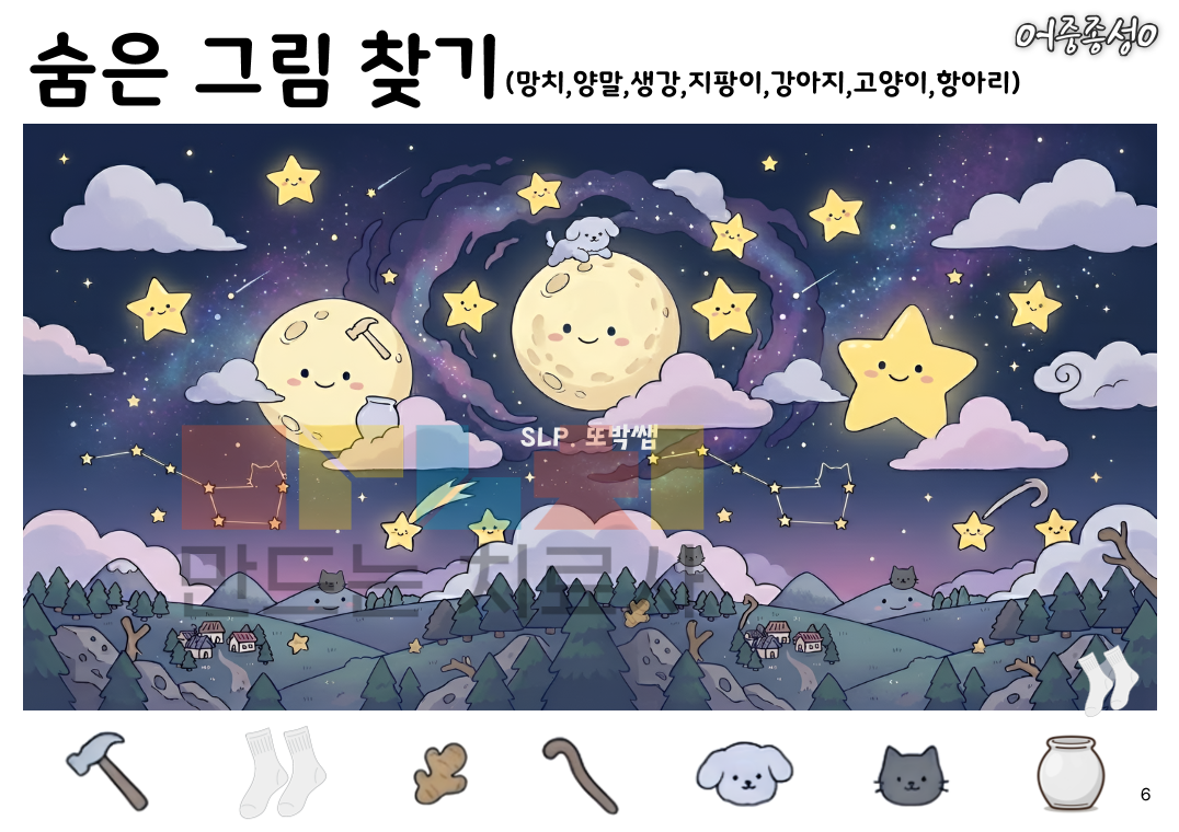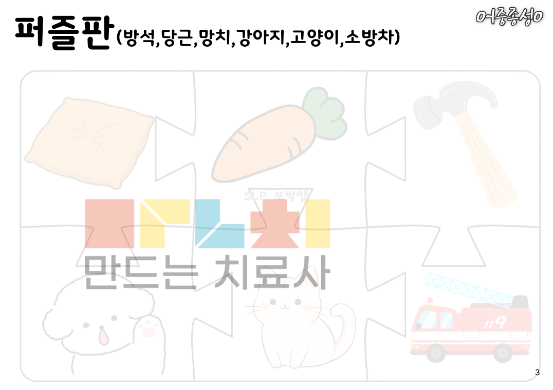 안녕하세요. 또박쌤입니다! 본 자료는 어중종성과 어말종성 ㅇ 위치에서 조음이 어려운 대상자들을 위해 제작하였습니다. 퍼즐판과 숨은 그림 찾기 활동을 통해 즐거운 조음 연습 시간이 되길 바랍니다. 감사합니다.