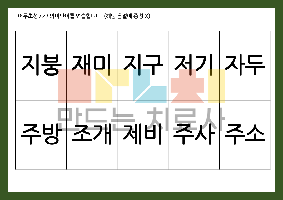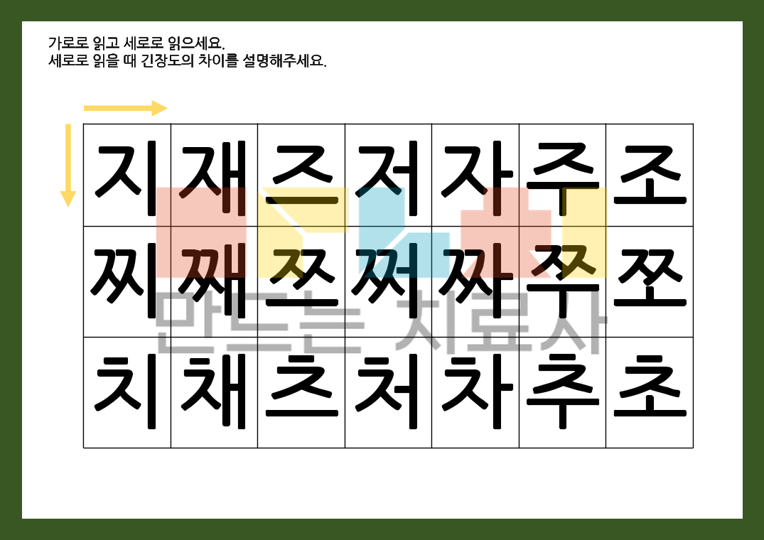 말운동장애, 학령기 이상 학생의 파찰음 연습 활동지로 사용해보세요! 본 활동지는 글자로만 구성되어 있습니다. [ 목차 ] 총 45p - 무의미, 의미 단어 (22p) - 2어절 문장 (5p) - 문장 (6p) - 문단글 (8p) - 자발화 단어: 단어 연상 (2p) - 자발화 단어: 끝음절 활용 연습(1p)