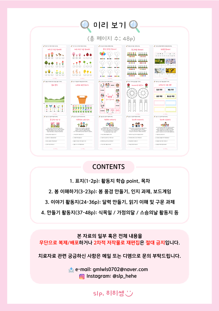 안녕하세요 선생님들! 히히쌤입니다 ◡̎ 이번 자료는 우리나라의 첫 번째 계절! 봄 활동지를 제작하였습니다🌸 🔍 학습 point 🔍 - 봄 어휘 학습을 통해 계절 이해도를 높여요. - 기초 인지 능력(변별, 분류, 비교)을 키워요. - 이야기 활동으로 구문능력 및 읽기 이해력을 키워요. - 다양한 만들기 활동으로 언어 사고력 및 창의력을 키워요. 치료자료 관련 궁금하신 사항은 메일 또는 디엠으로 문의 부탁드립니다! 📩 e-mail: gmlwls0702@naver.com 📩 Instagram: @slp_hehe