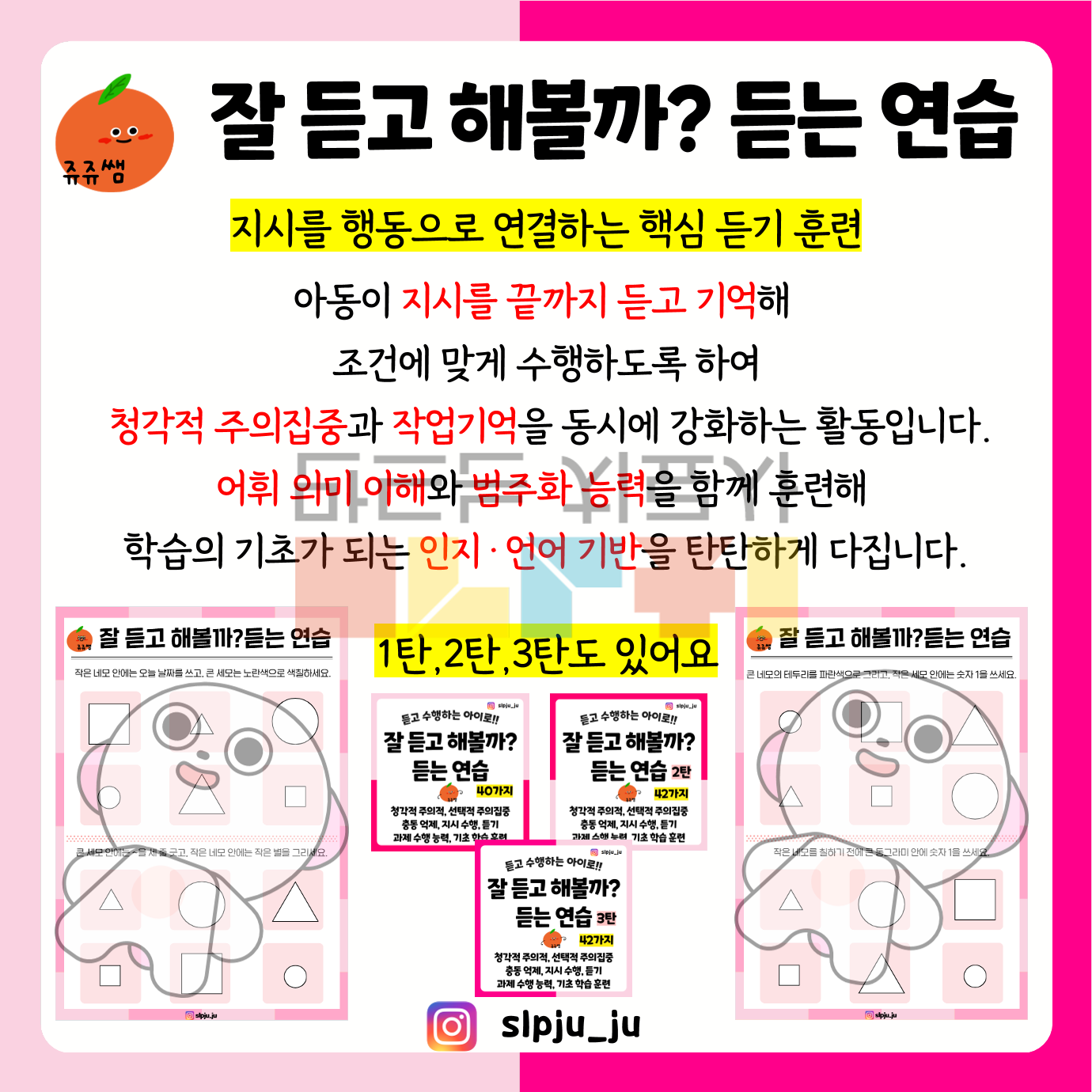 안녕하세요 쥬쥬쌤입니다. 아동이 지시를 끝까지 듣고 기억해 조건에 맞게 수행하도록 하여 청각적 주의집중과 작업기억을 동시에 강화하는 활동입니다. 어휘 의미 이해와 범주화 능력을 함께 훈련해 학습의 기초가 되는 인지·언어 기반을 탄탄하게 다집니다