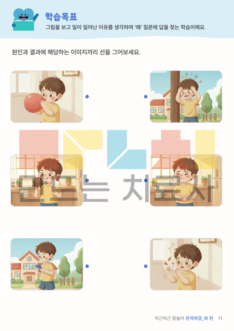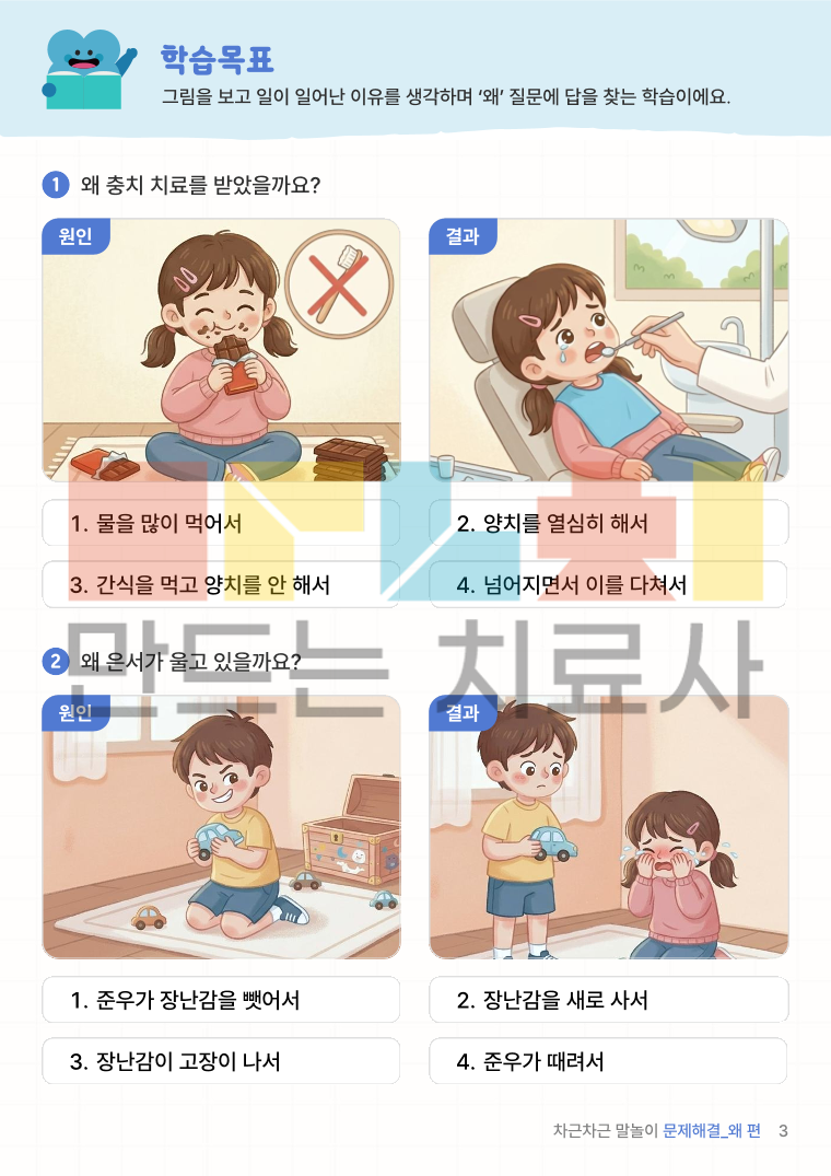 「차근차근 말놀이_문제해결_왜 편」 학습지는 아동이 그림과 상황을 통해 의미, 문장, 이야기 흐름을 단계적으로 이해하도록 돕는 언어치료 중재 중심 학습지입니다. 개념을 처음 인식하고, 시각적 단서를 통해 구분하며, 선택과 배열 활동을 통해 의미를 이해하고, 이야기 맥락 속에서 자연스럽게 언어 이해를 확장하도록 구성되어 있습니다. 치료실 수업, 소그룹 수업, 가정 연계 과제까지 바로 활용할 수 있도록 구성된 언어 중재 학습지 시리즈입니다.