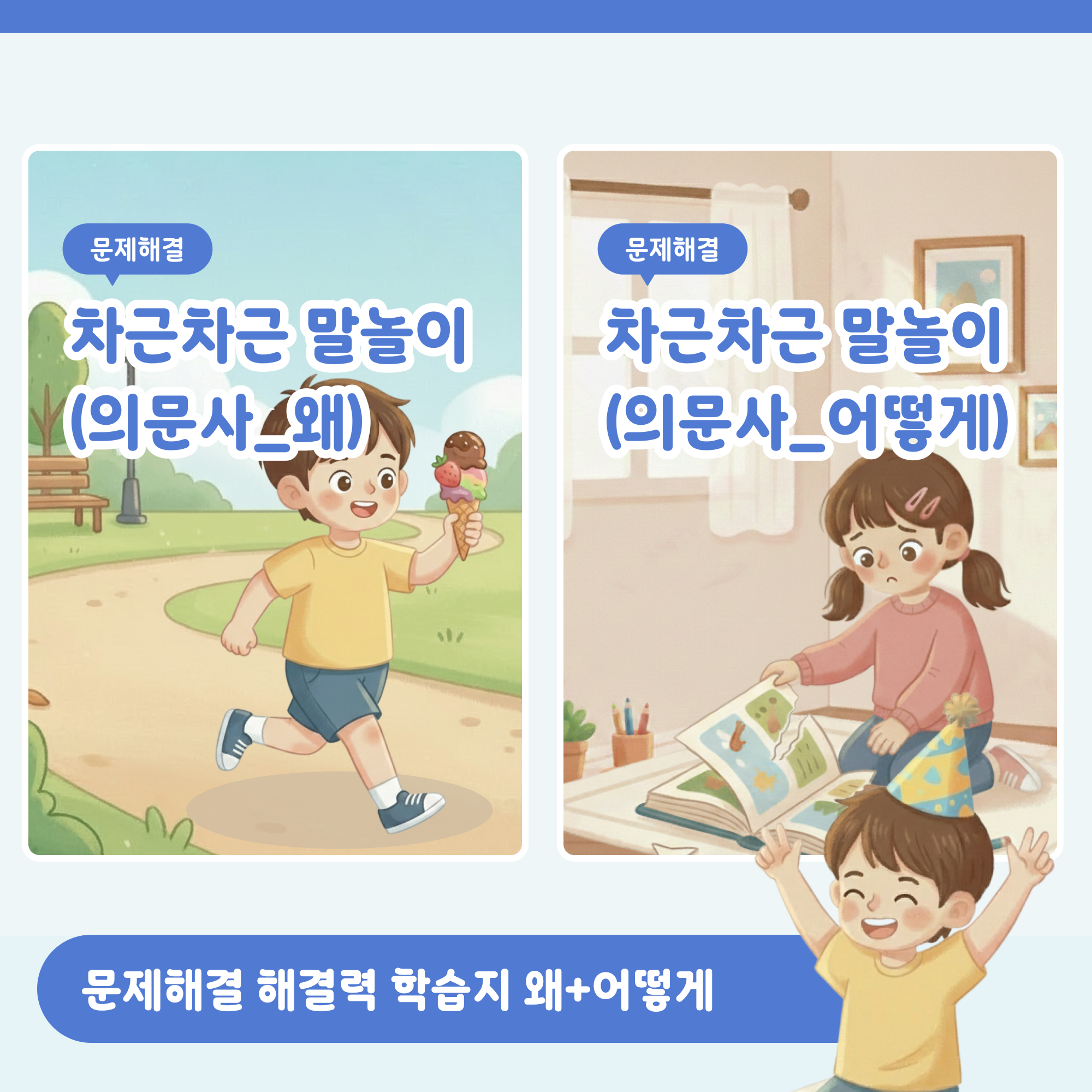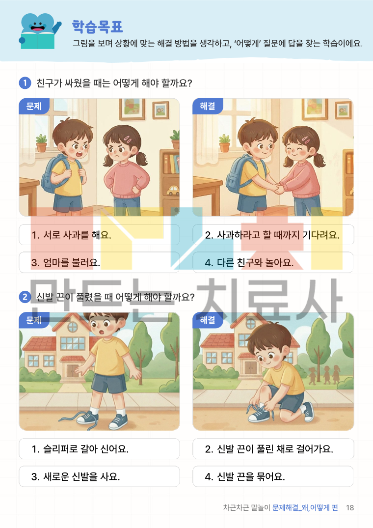 「차근차근 말놀이_문제해결(왜·어떻게) 편」 학습지는 아동이 그림과 상황을 통해 사건의 이유와 해결 방법을 이해하도록 돕는 언어치료 중재 중심 학습지입니다. 상황의 원인을 이해하는 ‘왜’ 질문에서 시작하여, 문제를 해결하는 방법을 생각하는 ‘어떻게’ 단계로 확장되도록 구성되어 있으며, 개념을 처음 인식하고, 시각적 단서를 통해 구분하며, 선택과 배열 활동을 통해 의미를 이해하고, 이야기 맥락 속에서 자연스럽게 언어 이해를 확장하도록 구성되어 있습니다. 치료실 수업, 소그룹 수업, 가정 연계 과제까지 바로 활용할 수 있도록 구성된 언어 중재 학습지 시리즈입니다.