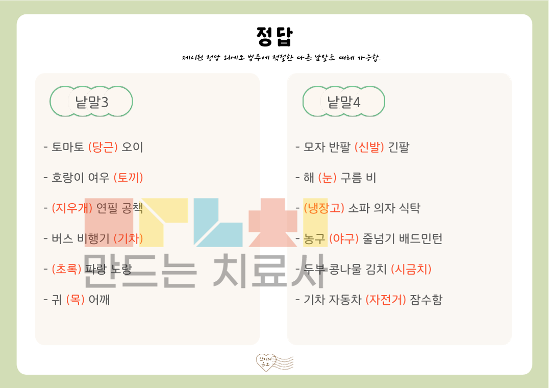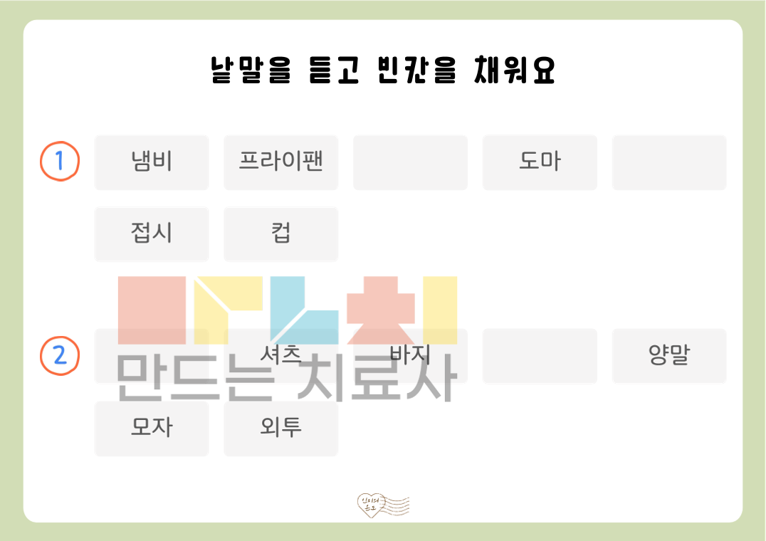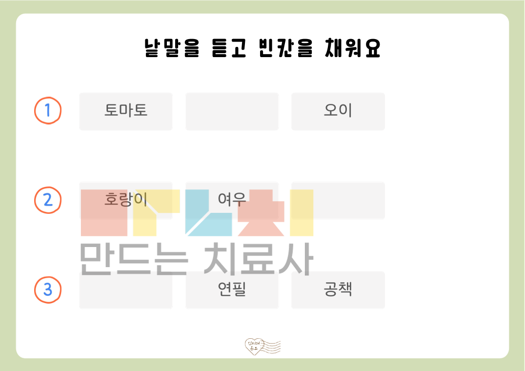 안녕하세요. 인지의 온도입니다. 본 활동지는 ‘듣고 빈칸 채우기(낱말)’ 활동지로, 제시된 순서의 낱말을 들으며 빈칸에 들어갈 낱말을 채우는 활동입니다. 여러 낱말을 순서대로 듣고 이를 유지 및 처리하는 과정을 통해 청각 주의력, 작업 기억, 순서 처리 능력을 기를 수 있습니다. [!] 낱말을 들으며 동시에 쓰거나, 순서를 모두 들은 후 기억하여 쓰는 방식으로도 진행할 수 있습니다. ◎표지1, 활동지20(낱말3~5개: 각 3문항씩 2p 빈칸 1개 , 낱말6~10개: 각 2문항씩 2p 빈칸 2개, 정답지4p)