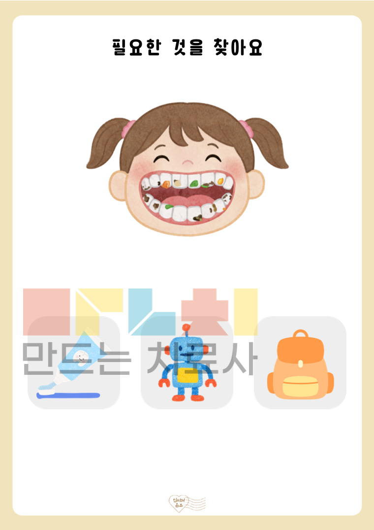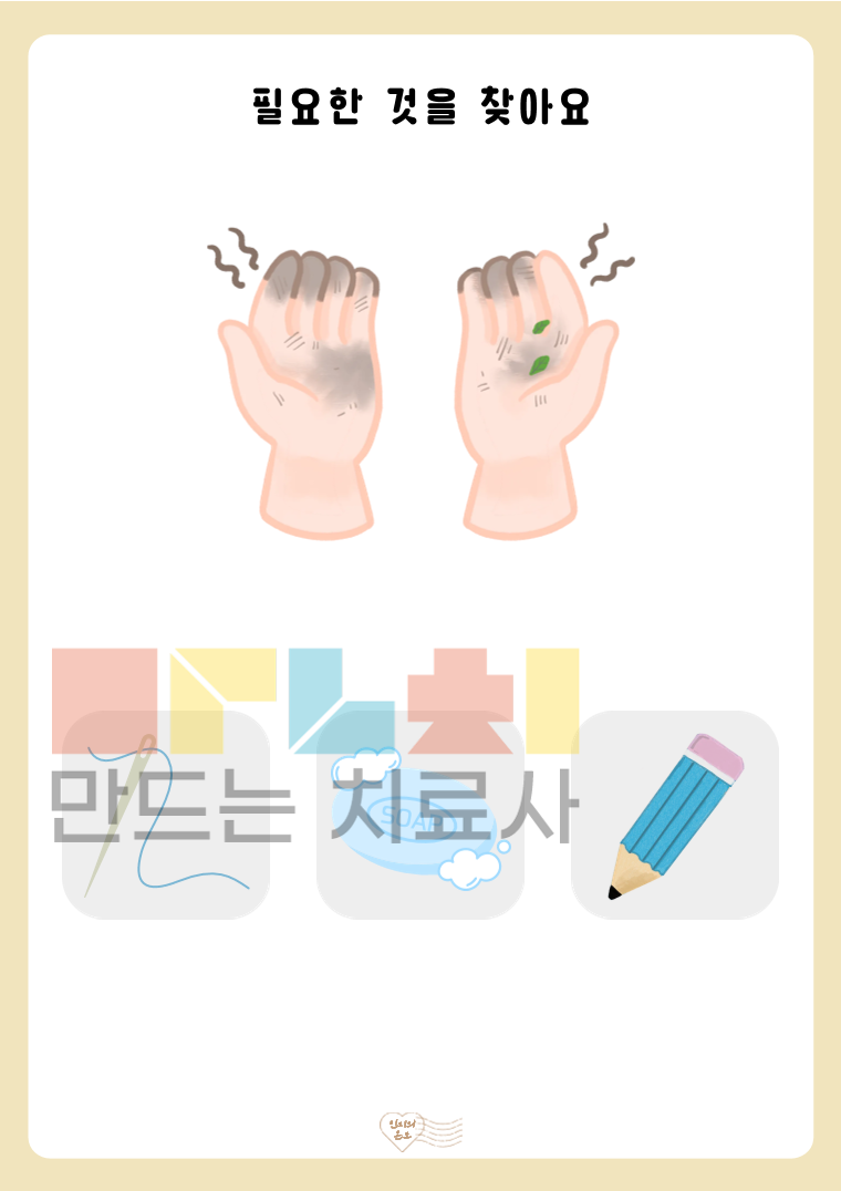 안녕하세요. 인지의 온도입니다. 본 활동지는 ‘필요한 물건을 찾아요(기초)’ 활동지로, 제시된 상황을 보고 해당 상황에 필요한 물건을 선택하는 활동입니다. 기초 단계는 명확한 단서를 바탕으로 정답이 하나로 도출되도록 설계되었습니다. 그림 속 상황을 이해하고, 문제를 해결하기 위해 적절한 도구를 선택하는 과정을 통해 상황 이해력, 문제 해결력, 기능적 사고 능력을 기를 수 있습니다. ◎표지1, 활동지20