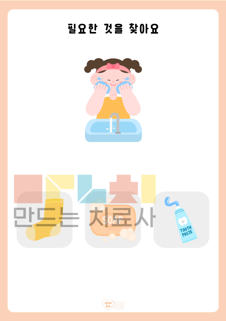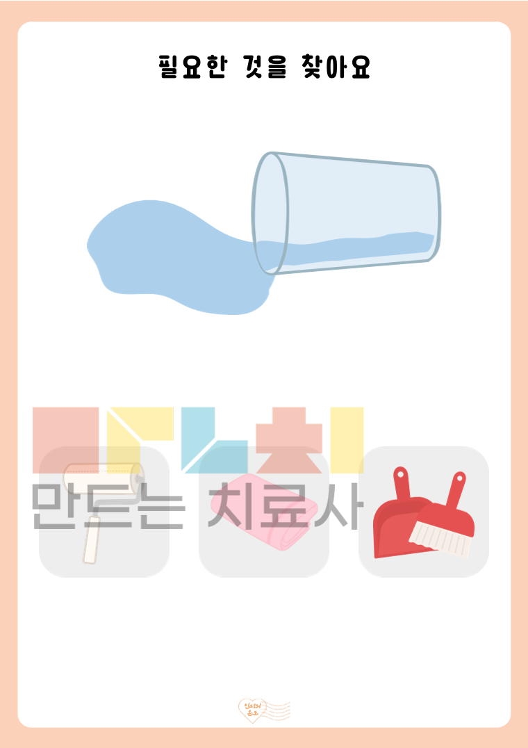 안녕하세요. 인지의 온도입니다. 본 활동지는 ‘필요한 물건을 찾아요(기본)’ 활동지로, 제시된 상황을 보고 해당 상황에 필요한 물건을 선택하는 활동입니다. 기본 단계는 선택지 중에서 가장 적절한 것을 판단하도록 구성되어 있으며, 유사한 상황-기능을 가진 물건을 함께 제시하여 사고를 확장할 수 있도록 설계되었습니다. 그림 속 상황을 이해하고, 문제를 해결하기 위해 적절한 도구를 비교·선택하는 과정을 통해 상황 이해력, 문제 해결력, 기능적 사고 능력, 비교 및 판단 능력을 함께 기를 수 있습니다. ◎표지1, 활동지20