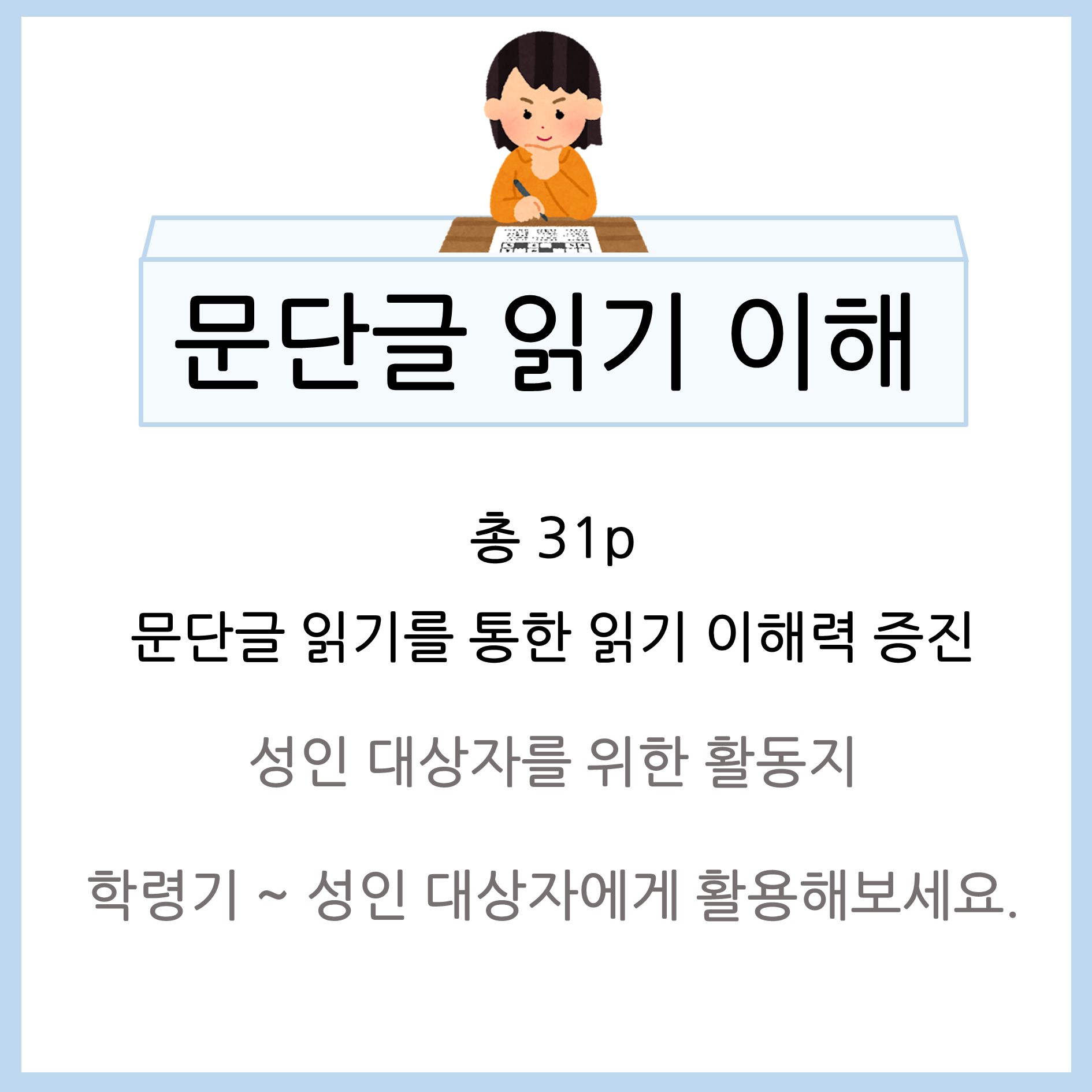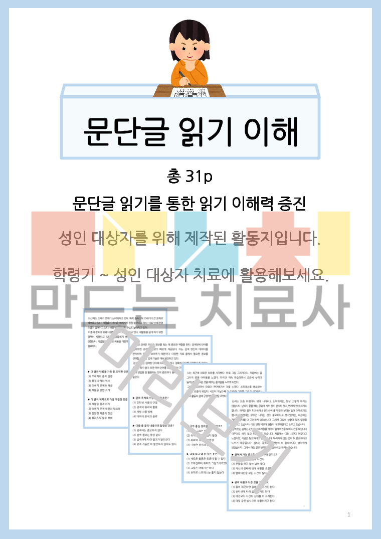 총 31p 문단글 읽기를 통한 읽기 이해력 증진 성인 대상자를 위해 제작된 활동지입니다. 학령기 ~ 성인 대상자 치료에 활용해보세요.