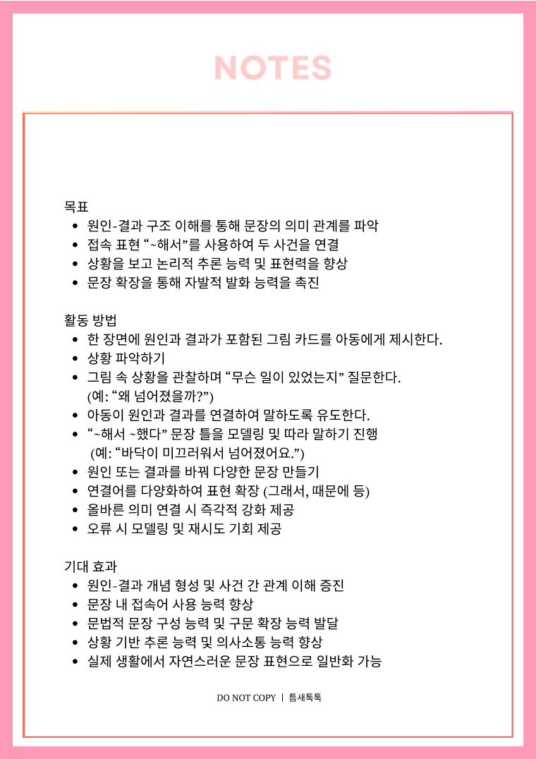 목 표 원 인- 결과 구 조 이 해 를 통 해 문 장 의 의 미 관계 를 파 악 접 속 표 현 “~ 해 서 ” 를 사 용 하 여 두 사 건 을 연 결 상 황 을 보 고 논 리 적 추 론 능 력 및 표 현 력 을 향 상