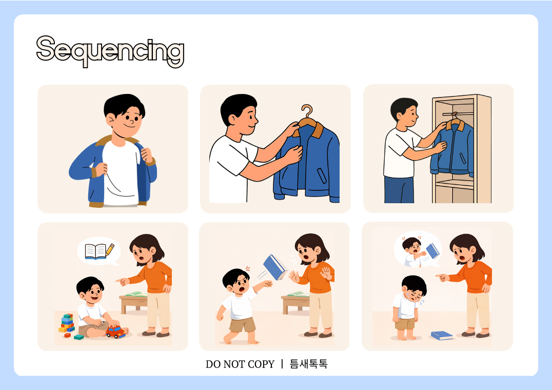 글자가 없는 3컷 그림을 보며 아이가 스스로 이야기를 만들어가는 활동입니다 정답이 정해져 있지 않아 아이의 생각과 언어를 자연스럽게 이끌어낼 수 있어요. 그림의 순서를 이해, 상황의 흐름 파악, 자신의 말로 이야기 표현하는 과정 이해력, 표현력 이야기구성능력이 함께 향상됩니다. 특히 말이 적은 아이 문장 연결이 어려운 아이 상황 설명이 서툰 아이에게 효과적인 활동