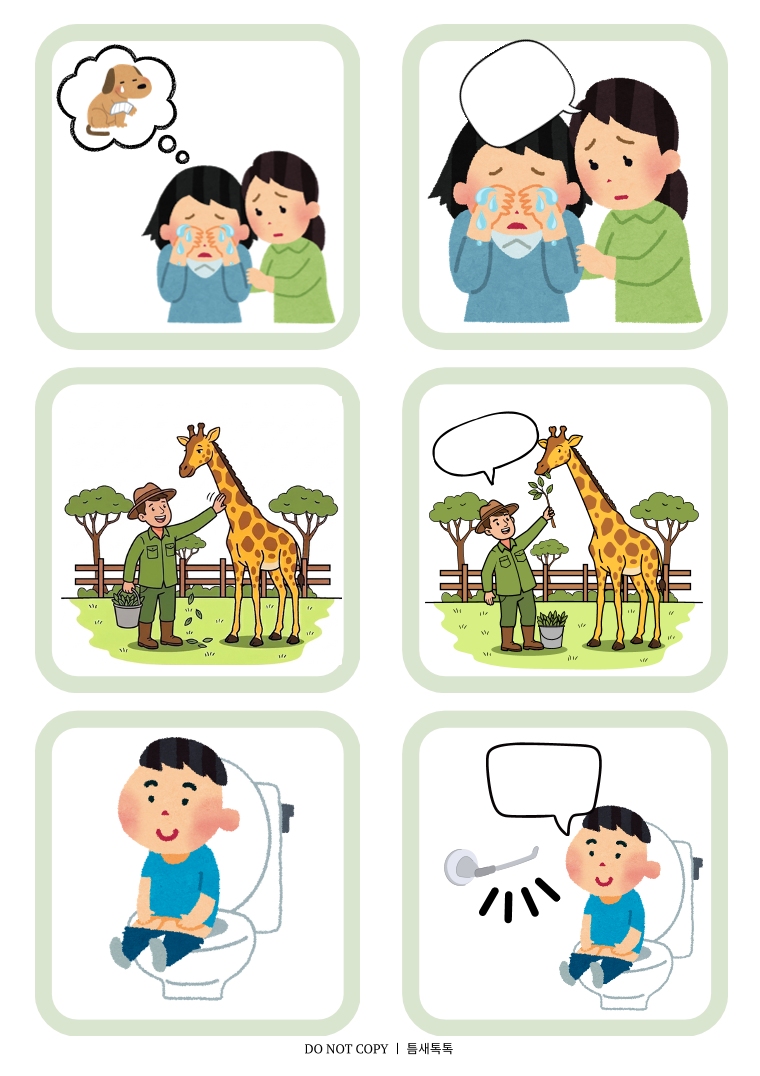 일상에서 자주 겪는 다양한 상황을 그림으로 제시하고, 아이 스스로 상황을 이해하고 말로 표현할 수 있도록 돕는 언어 학습 교재입니다.학습 목표 상황 이해 및 설명하기 적절한 말하기 (화용언어) 원인-결과 추론 능력 향상 사회적 의사소통 능력 강화 본 자료는 파일 용량 제한으로 인해 PART 1 / PART 2 / PART 3으로 나누어 제공됩니다. 각 파트는 서로 다른 상황 구성으로 이루어져 있으며, 함께 활용하실 때 학습 효과가 더욱 높아집니다.