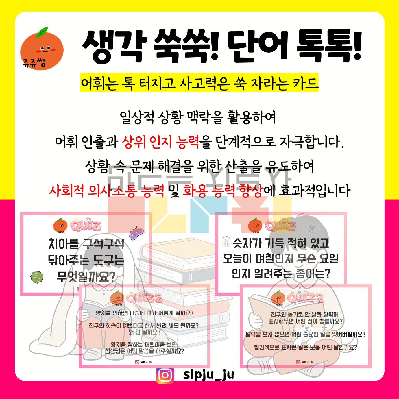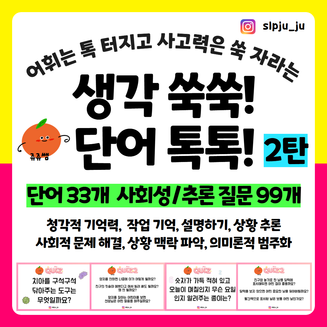 안녕하세요 쥬쥬쌤입니다. 일상적 상황 맥락을 활용하여 어휘 인출과 상위 인지 능력을 단계적으로 자극합니다. 상황 속 문제 해결을 위한 산출을 유도하여 사회적 의사소통 능력 및 화용 능력 향상에 효과적입니다