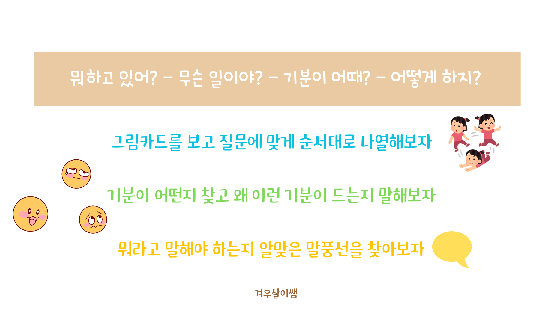 1) 그림카드를 보고 순서대로 나열하기 2) 순서대로 나열된 그림을 보고 질문에 답하기 3) 빈 칸에 알맞은 기분 붙이기 - 말하기 4) 어떻게 해야 할 지 말하기 5) 말풍선을 완성하며 직접 말로 표현하기