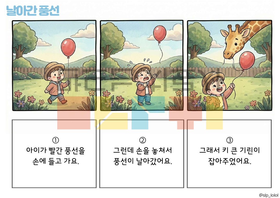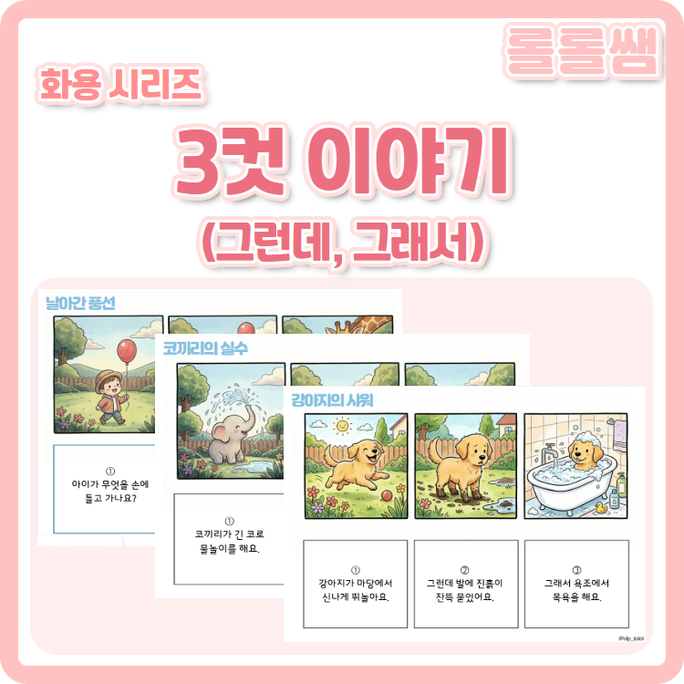 안녕하세요. 롤롤쌤의 화용 시리즈, '3컷 이야기(그런데, 그래서)' 입니다! 이야기 문법을 3단계로 단순화하여 담화 수준의 언어 능력으로 나아가도록 도와주는 자료입니다. 접속사 '그런데/그래서'의 반복 연습으로 논리적 연결성을 강화합니다. * 20가지의 3컷 만화 * 만화 당 3개씩, 총 60개의 의문사 질문 · 구성 : 총 41p. (표지 포함) 이렇게 활용해보세요! ① 이야기 듣고 3컷 만화 순서 정렬하기 ② 그림 보고 3컷 만화 이야기하기 ③ 이야기 질문에 답하기