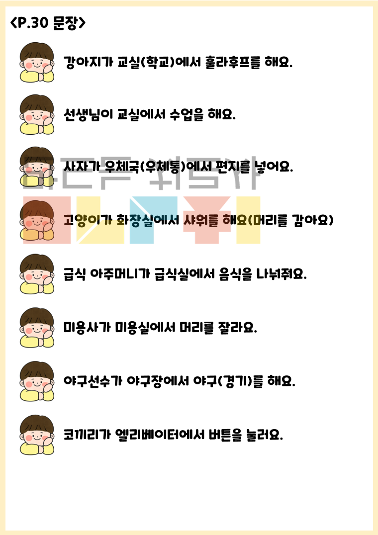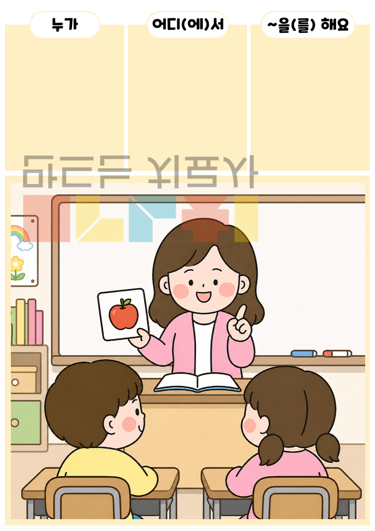 안녕하세요! 이음쌤입니다. 이 자료는 그림을 보고 “누가, 어디서, 무엇을, 해요”의 구조로  문장을 만들어보는 4어문 말하기 활동 자료입니다.   아동은 상황이 담긴 그림을 보며 주어, 장소, 목적어, 동사를  순서대로 표현하는 연습을 하게 되고, 이를 통해 자연스럽게  문장 길이를 확장할 수 있습니다.  언어치료실에서는 자발화를 유도하고 조사 사용을 연습하는 데 효과적이며, 가정에서도 부모와 함께 질문과 답변 형태로 반복 연습하며 어휘와 문장 표현 능력을 동시에 기를 수 있는 활동입니다!