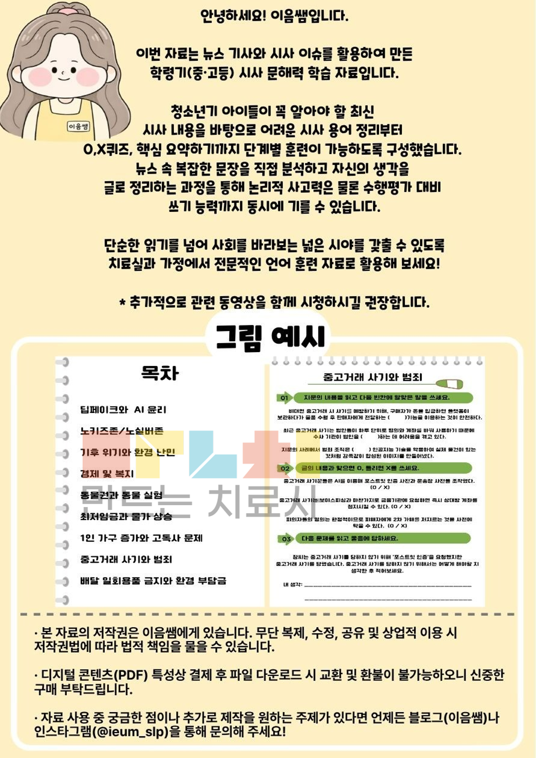 안녕하세요! 이음쌤입니다. 이 자료는 처음 제작한 언어치료 자료입니다! 뉴스 기사와 시사 이슈를 활용하여 만든 학령기(중•고등) 시사 문해력 학습 자료입니다. 청소년기 아이들이 꼭 알아야 할 최신 시사 내용을 바탕으로 어려운 시사 용어 정리부터 0,X퀴즈, 핵심 요약하기까지 단계별 훈련이 가능하도록 구성했습니다. 뉴스 속 복잡한 문장을 직접 분석하고 자신의 생각을 글로 정리하는 과정을 통해 논리적 사고력은 물론 수행평가 대비 쓰기 능력까지 동시에 기를 수 있습니다. 단순한 읽기를 넘어 사회를 바라보는 넓은 시야를 갖출 수 있도록 치료실과 가정에서 전문적인 언어 훈련 자료로 활용해 보세요! * 추가적으로 관련 동영상을 함께 시청하시길 권장합니다.