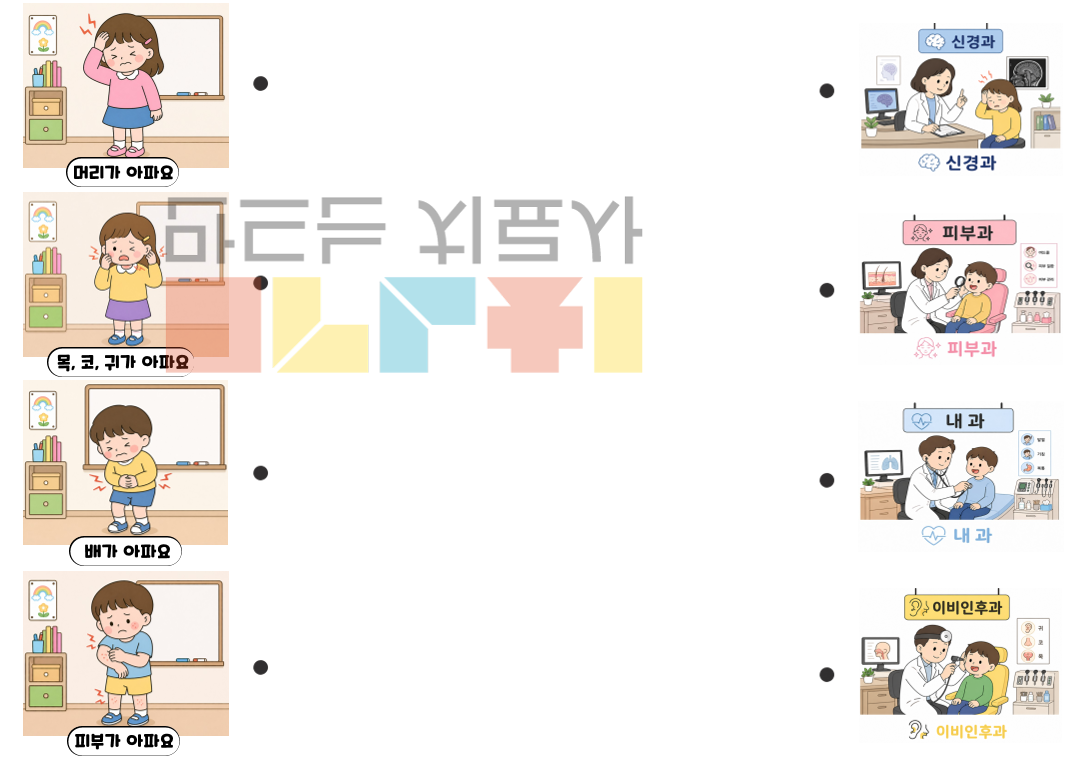안녕하세요~ 이음쌤입니다! 이번 자료는 "여기가 아플 땐 어디로 가지?"라는 자료입니다. 이 자료는 ‘어디로 가야 할까?’라는 주제를 통해 아이들이 일상에서 자주 겪을 수 있는 상황을 이해하고 적절한 선택을 할 수 있도록 돕는 언어치료 활동 자료입니다. 다양한 신체 증상과 병원 종류를 연결하며 어휘를 확장하고, 상황에 맞는 의미를 파악하는 능력을 자연스럽게 기를 수 있습니다. 또한 그림과 함께 제시된 상황을 해석하고 선택하는 과정에서 추론 능력을 함께 향상시킬 수 있습니다.