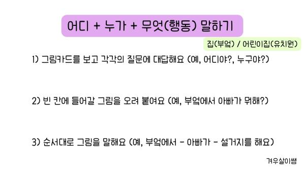 어디 + 누가 + 무엇(행동) 말하기 [집(부엌)/어린이집(유치원)]
