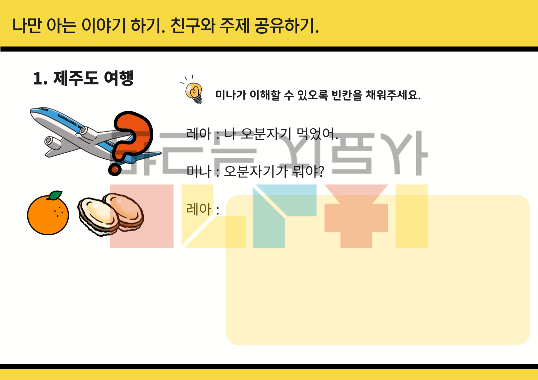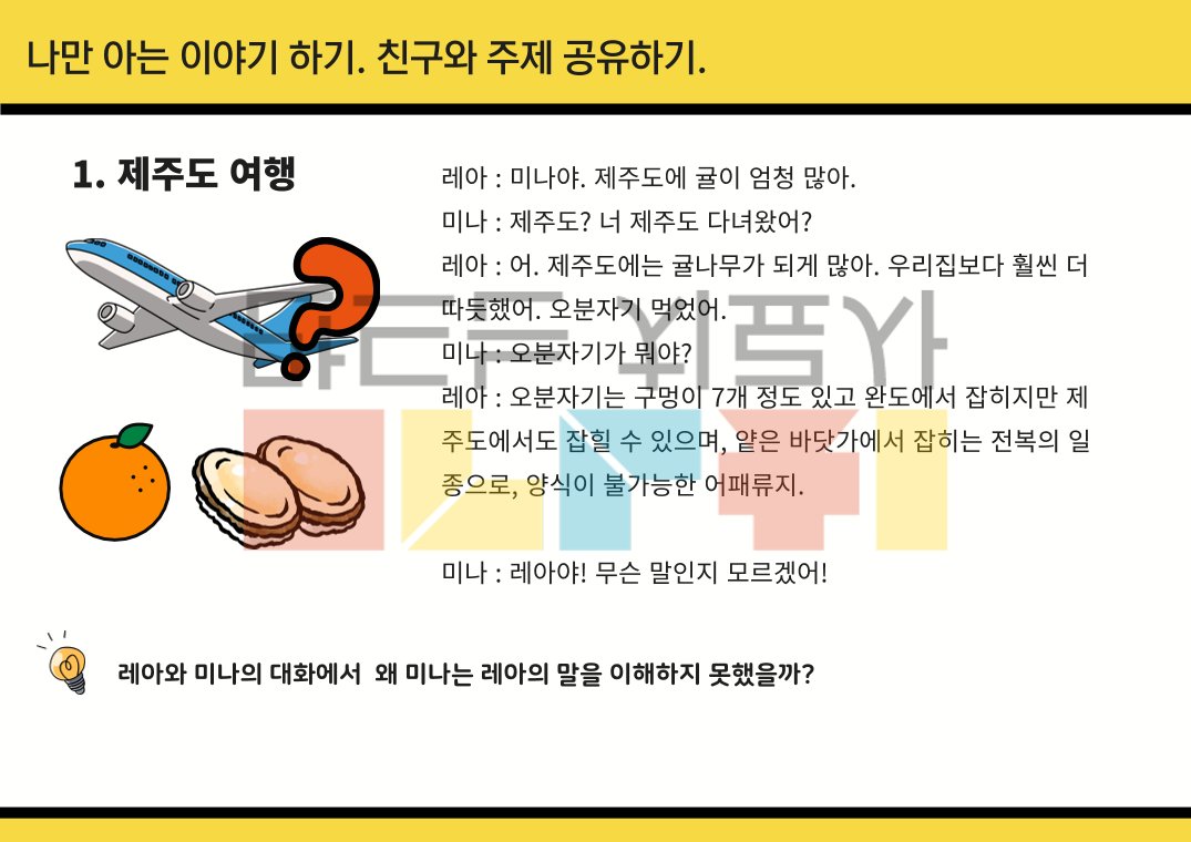 안녕하세요 라라 입니다! 제가 치료하는 아동은 친구와 함께 주제 공유하는 것을 어려워해요. 그래서 고기능 자폐스펙터럼 친구를 위해 만든 활동지 <레아와 미나>시리즈 입니다. - 자신이 알고 있는 지식을 상대방이 이해할 수 있도록 대화 중 설명하기 - 대화 시 자연스러운 주제 변경하기 이와 같은 내용을 담아 대화 스크립트로 만들었습니다. 활동 목표 1. 어떤 점이 이상한지 발견하기 2. 대화를 어떻게 변경 해야 하는지 적어 보기 총 3가지의 에피소드가 있습니다. 추천 연령 읽기 수업이기 때문에 학령기 친구에게 추천합니다. 감사합니다~!