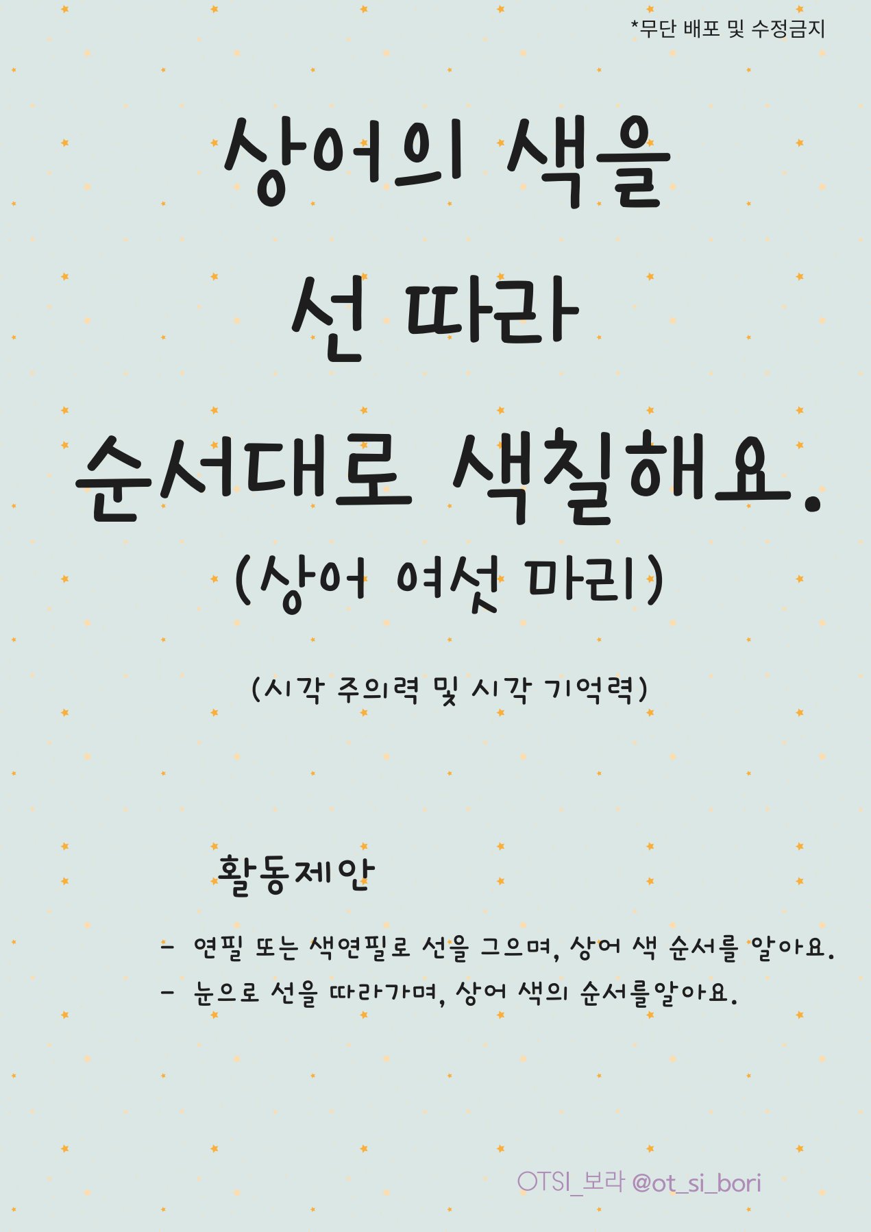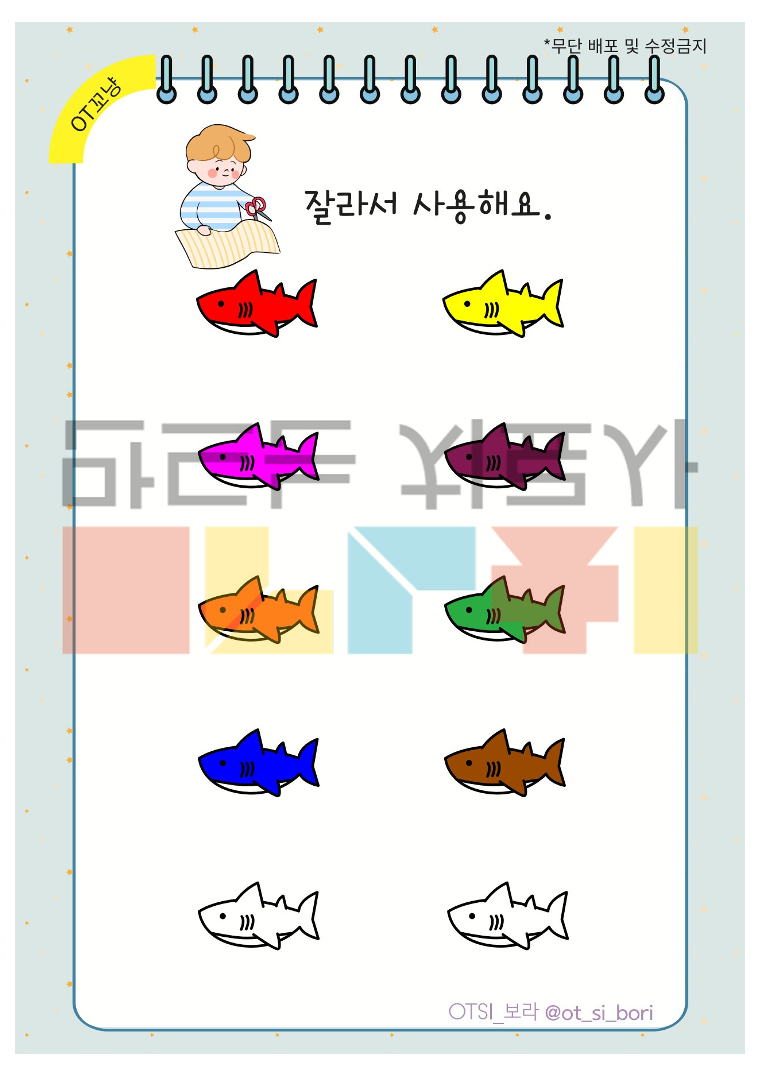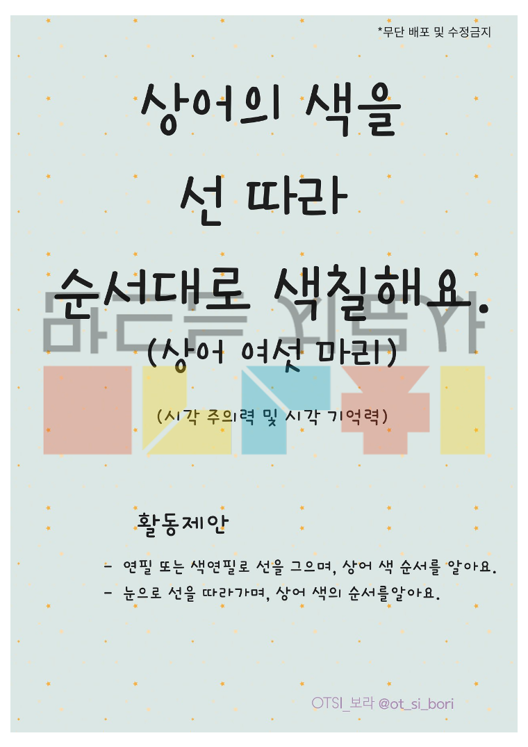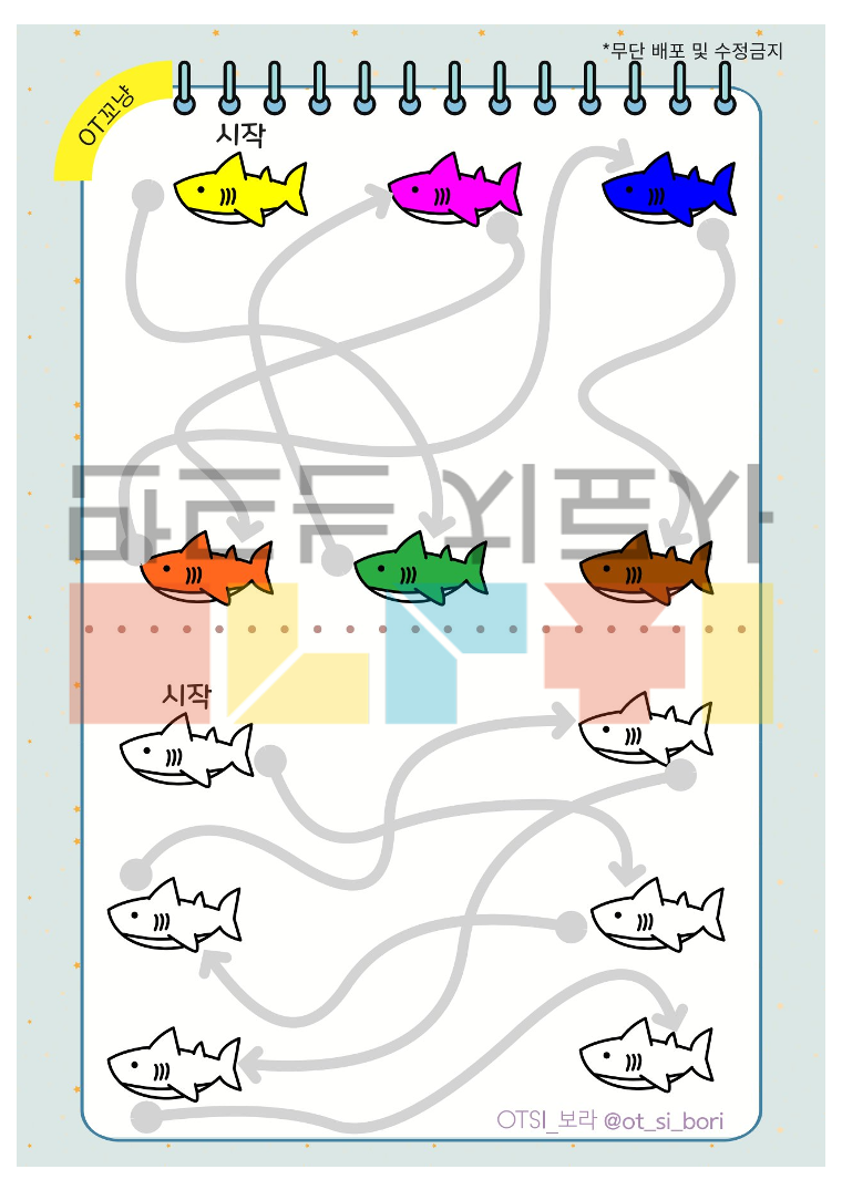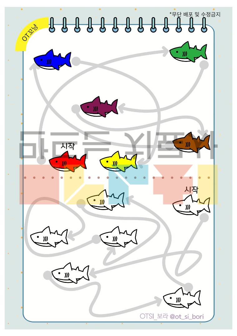 눈 또는 손으로(연필, 색연필) 선긋기 및 주의력 활동지입니다. (시작) 상어에서 화살표를 따라 이동하며, 색의 순서를 기억하고, 아래의 흰 상어를 색칠 또는 상어를 잘라서 붙이는 활동지입니다. - 앞표지 2p, 활동안내 1p, 자르기(상어) 1p, 활동지 10p