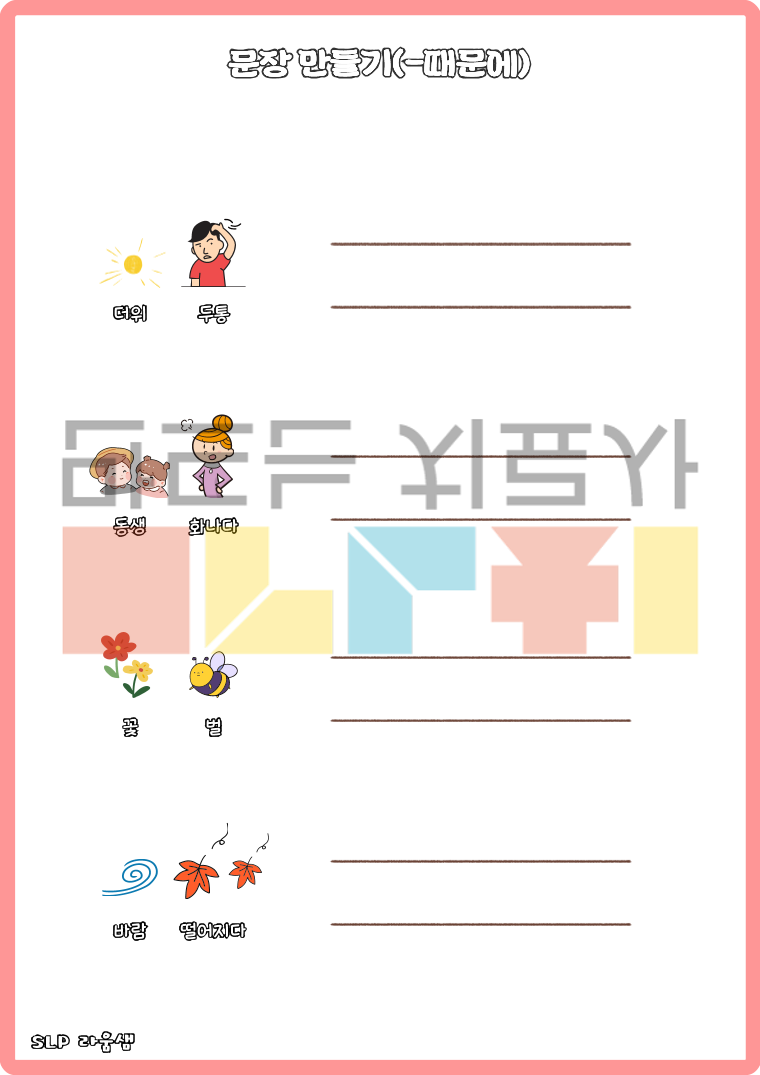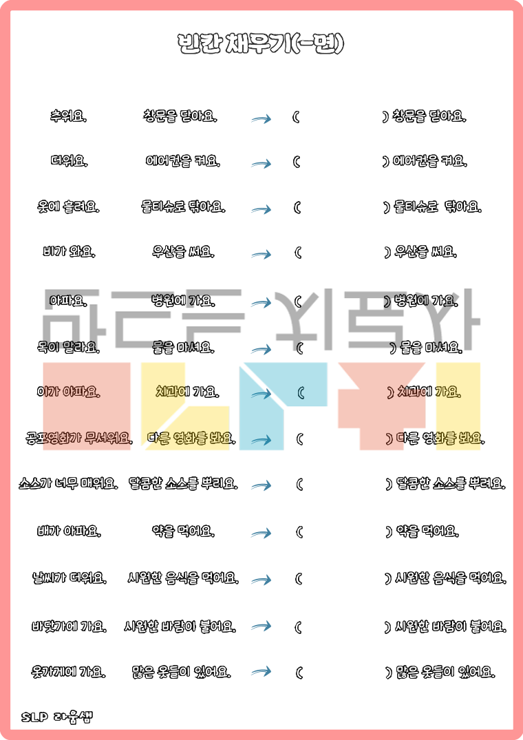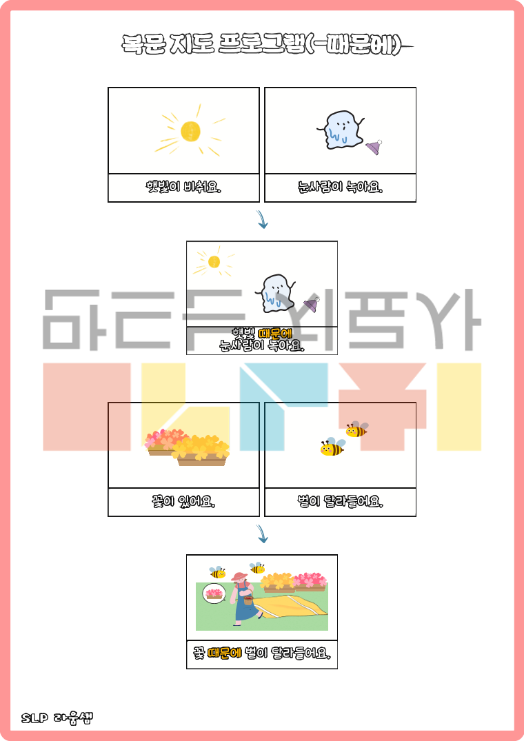 <복문지도프로그램-1~5권시리즈>는 총 9가지의 기능어를 익히고, 복문 지도를 위한 다양한 프로그램으로 구성되어있습니다. <1권>에서는 연결어미 ~서, ~면서, ~고를 익히고, <2권>에서는 -려고, -는데, <3권>에서는 -면, -때문에, <4권>에서는 -다가, -한 다음에, <5권>에서는 -하기 전에를 익히고, 문법오류 판단 및 수정(9가지 문법에 대한) 활동으로 이루어져있습니다.