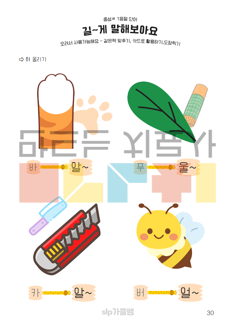 안녕하세요! 언어재활사 가을쌤입니다 ^-^ 제가 맡은 조음 아이들은 종성을 생략하는 아이들이 많았습니다. 그래서 종성을 소리내는 입모양부터 알기 쉽게 자료에 표현하였습니다. 각 종성 별 혀의 위치를 메모로 적어놓았습니다. 또 나이가 어린 영아부터 유아, 학생들이 쉽게 볼 수 있도록 큰 글자와 큰 그림으로 제작하였습니다. 종성 7개와 기본 모음 7개를 모음사각도에 대입하여 각 종성을 다양한 모음에서 연습할 수 있습니다. 무의미 음절부터 1음절단어까지 총 31페이지로 기초부터차곡차곡 연습할 수 있는 자료입니다.