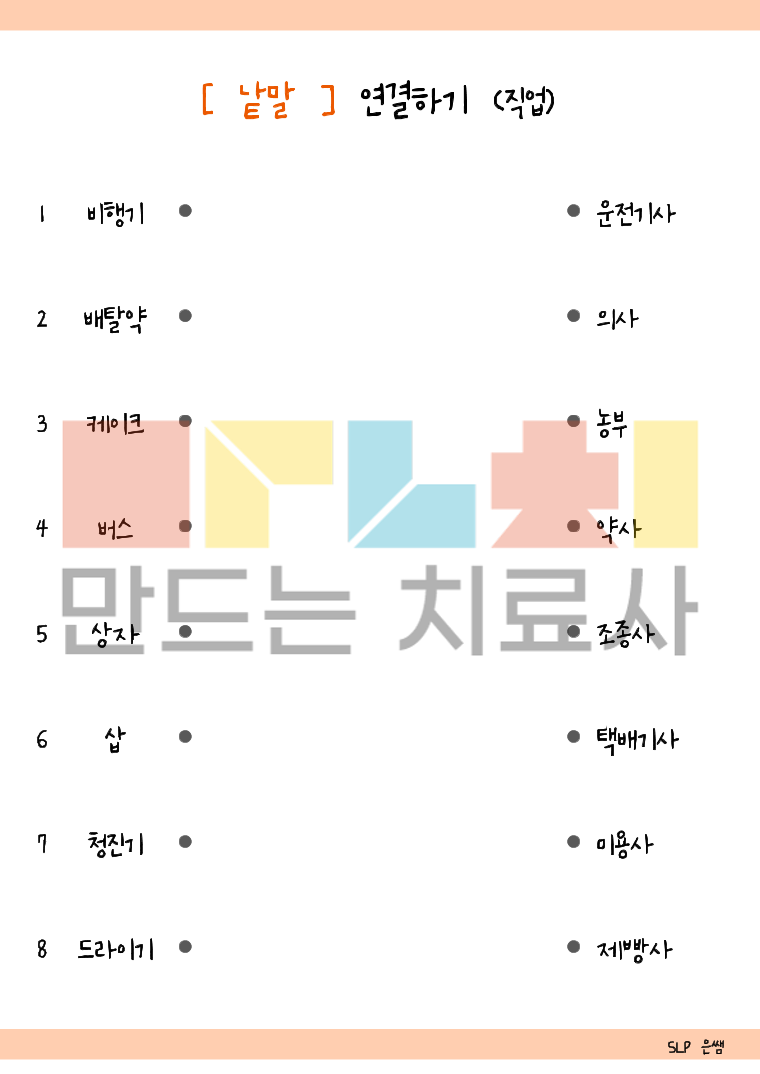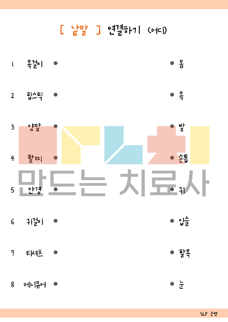 색깔, 모양, 어디(신체부위, 장소), 직업, 같이쓰는 물건, 사물의 다양한 특징 및 기능, 반대말, 비슷한 말, 같은 범주의 낱말을 연결하는 활동입니다.