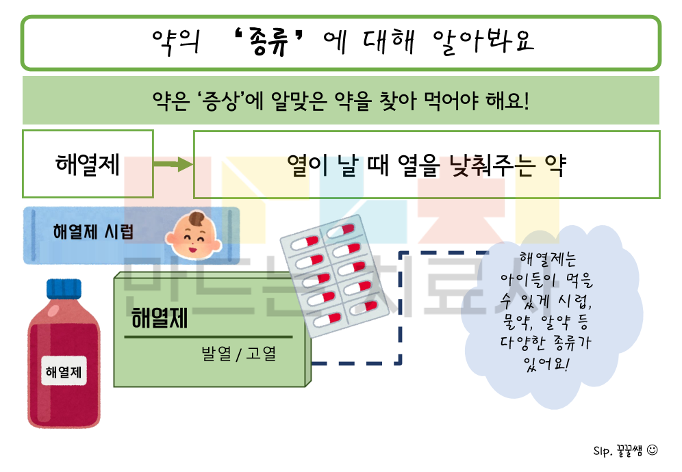 자폐나 지적장애 또는 학령기 친구들이 약을 스스로 찾아 먹을 수 있도록 하기 위해 고안된 학습지 입니다. 병의 증상, 약에 관련된 어휘, 약 복용법 등을 학습할 수 있습니다.