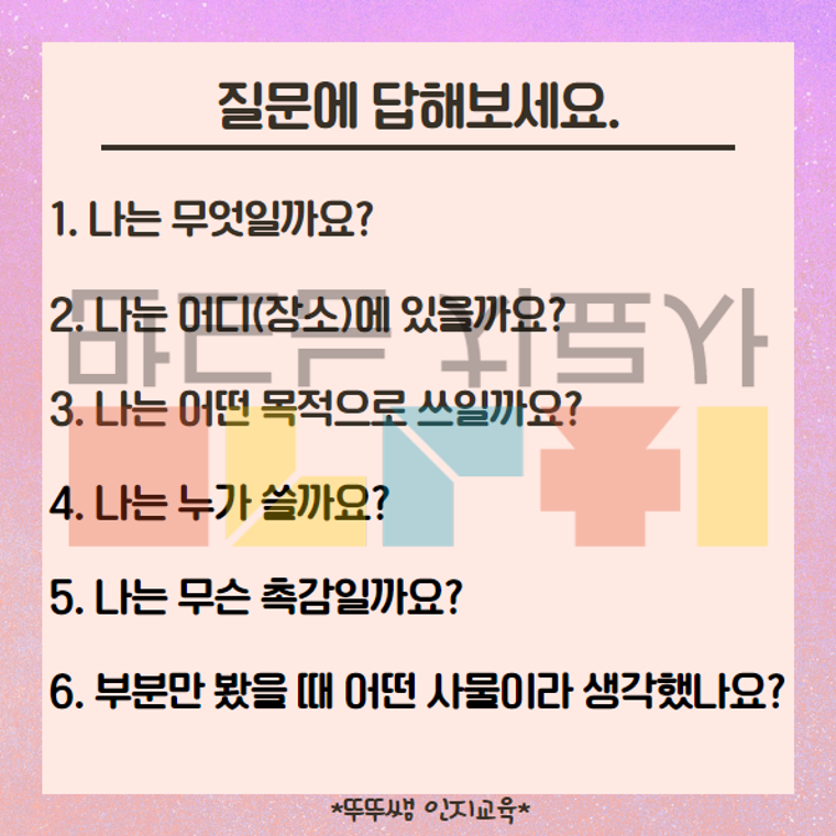 제목: 부분을 보고 전체 이해하기/ 인지ON 간략 소개글: 부분을 보고 전체를 알아가 봅니다. 상세 소개글: 부분을 보고 전체를 상상하며 추리해 봅니다. 관찰되는 한 부분으로 나머지 부분에 어떤 이미지가 있을지 생각해 봅니다. 사물에 대한 이해와 이 사물이 어떤 용도로 쓰이고 누굴 위한 것인지 알아가 보는 시간도 가져 봅니다. 페이지는 총 49장으로 구성되어 있으며 A4가로-세로 사이즈, PDF파일로 구성되어 있습니다. 대표 이미지1, 미리 보기 이미지 2,5 가격은 4500원 입니다.
