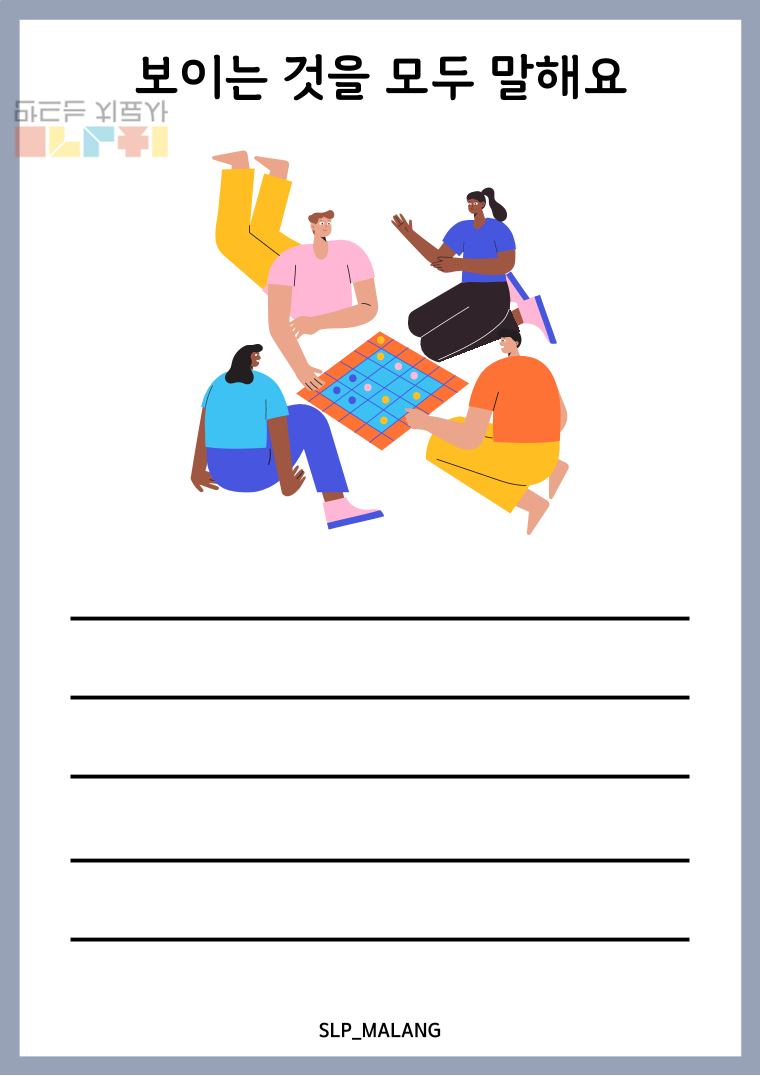 💙모두모두 말하기💙 이번 자료는 문장을 적어보고, 다양한 상황을 파악 해 볼 수 있는 자료입니다 이전에 1을 공유하였을 때 저는 지적장애 아동과 사용을 하기 위해서 제작하였어요 하지만 아이들이 생각보다 너무너무 잘 해주는 덕분에 이렇게 2편도 제작할 수 있게 되었답니다 학령기 아동 또는 학령전기 입학을 앞두고 있는 아동을 보면 생각보다 발화를 짧게 하거나, 대용어를 사용하는 아이들이 많이 있는 것 같아요😭 이런 아이들에게 길게 말해줘, 이렇게 해야지 라고 말은 하지만 생각보다 확장이 잘 되지 않고, 전이가 잘 되지 않는다고 느끼는 요즘입니다🥲 그런 아이들을 위해서 그림을 보고, 말을 해 볼 수 있는 자료를 만들었습니다 단순히 그림을 보고, 해당 그림이 어떤 장면인지, 무슨 상황인지만 이야기 하는 것이 아니라 이 사람이 지금 어떤 말을 하고 있을 것 같은지, 이 사람의 표정은 어떤지, 지금 이곳은 어디일지 등의 다양한 이야기를 해 볼 수 있도록 만들었습니다🧐 그림을 보면서 단순하게 말을 할 수도 있지만, 학령기 아이들을 위해서 글로 적을 수 있도록 만들기도 하였습니다 그림은 단순하게 딱 한 장면으로 이루어져있지만 알아보기 힘든 장면은 없으며 누가봐도 이것을 하고 있구나 라는 것을 제대로 알 수 있도록 그림을 선택하였습니다😤 이런 그림을 보면서 아이들이 좀 더 연습을 하고 나아가서는 일상생활에서 좀 더 사용을 할 수 있으면 하는 마음이랍니다 사용 방법은 보면 아주 단순하지만 다양하게 사용을 할 수 있도록 만들었습니다 선생님들의 다양한 사용으로 아이들에게 적합하게 적용 해 보시면 좋을 것 같습니다👍🏻 💛인스타그램💛 @slp_malang 💛블로그💛 https://blog.naver.com/csu04244 💛카카오톡 아이디💛 @말랑쌤 💛카카오톡 채널URL💛 http://pf.kakao.com/_xauxoqxj 문의사항은 카카오톡이나 DM 주세요 !!