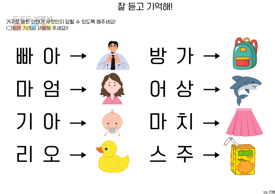 안녕하세요~! 수업을 하면서 인지적인 어려움을 보이는 친구들이 많습니다. 그래서 다양한 인지적인 활동을 진행할 수 있도록 자료를 구성하였습니다! 이 자료를 통해 작업기억, 청각적 기억력, 교대 주의력 등을 향상 할 수 있도록 구성하였습니다!