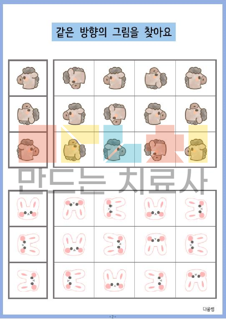 <활동 목표> 시지각, 공간위치지각, 시각변별, 회전그림 구분, 주의력 <활동 방법> 제시된 그림과 같은 방향의 그림을 찾는 활동 입니다. <활동지> 총 30p 2~15p 컬러 그림 16~19p 숫자 그림 20~30p 흑백 그림, 문자표