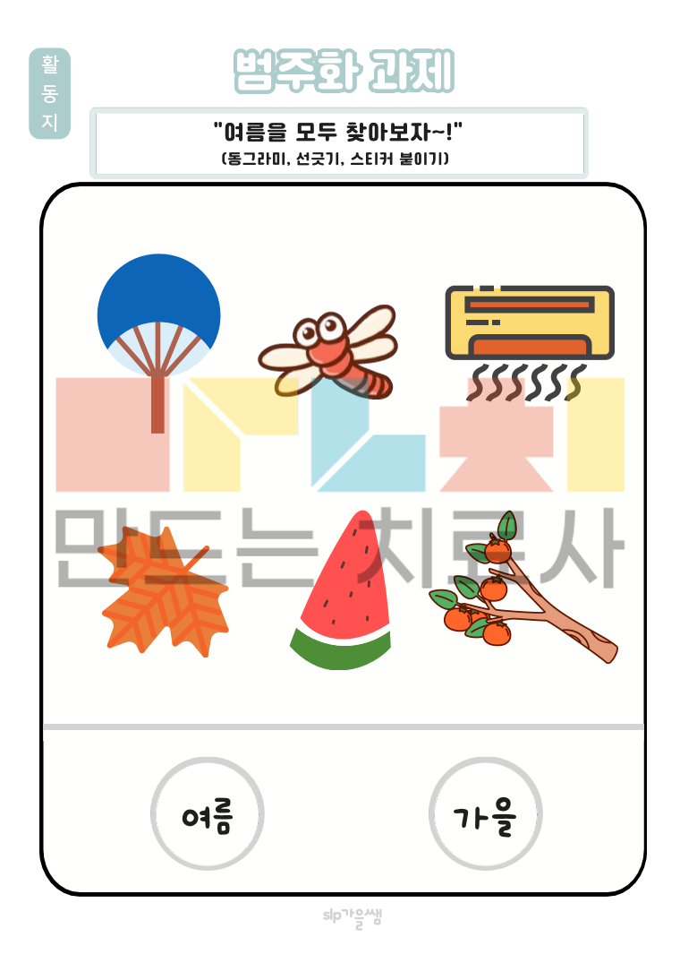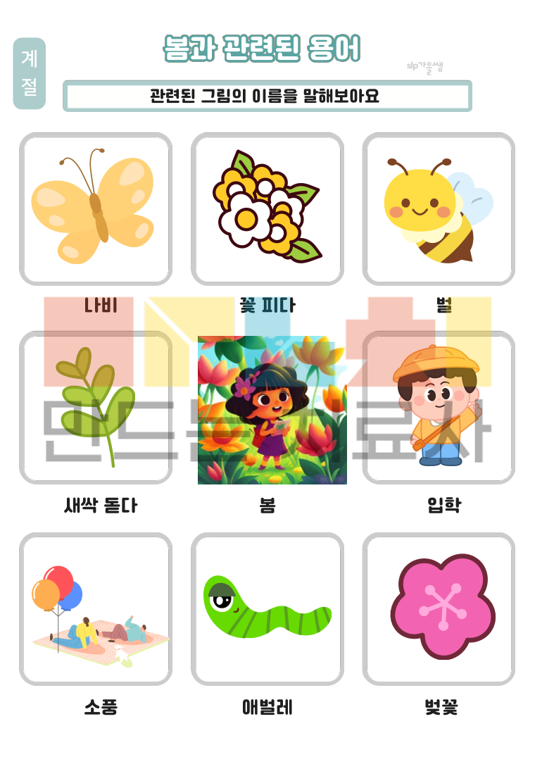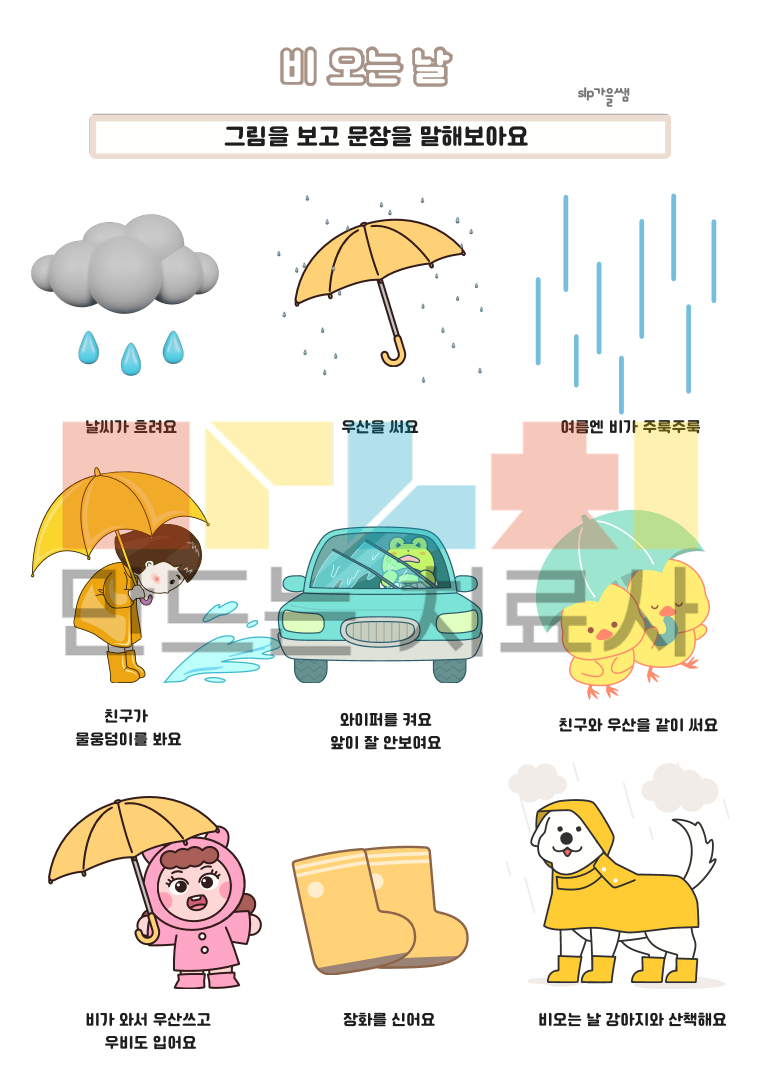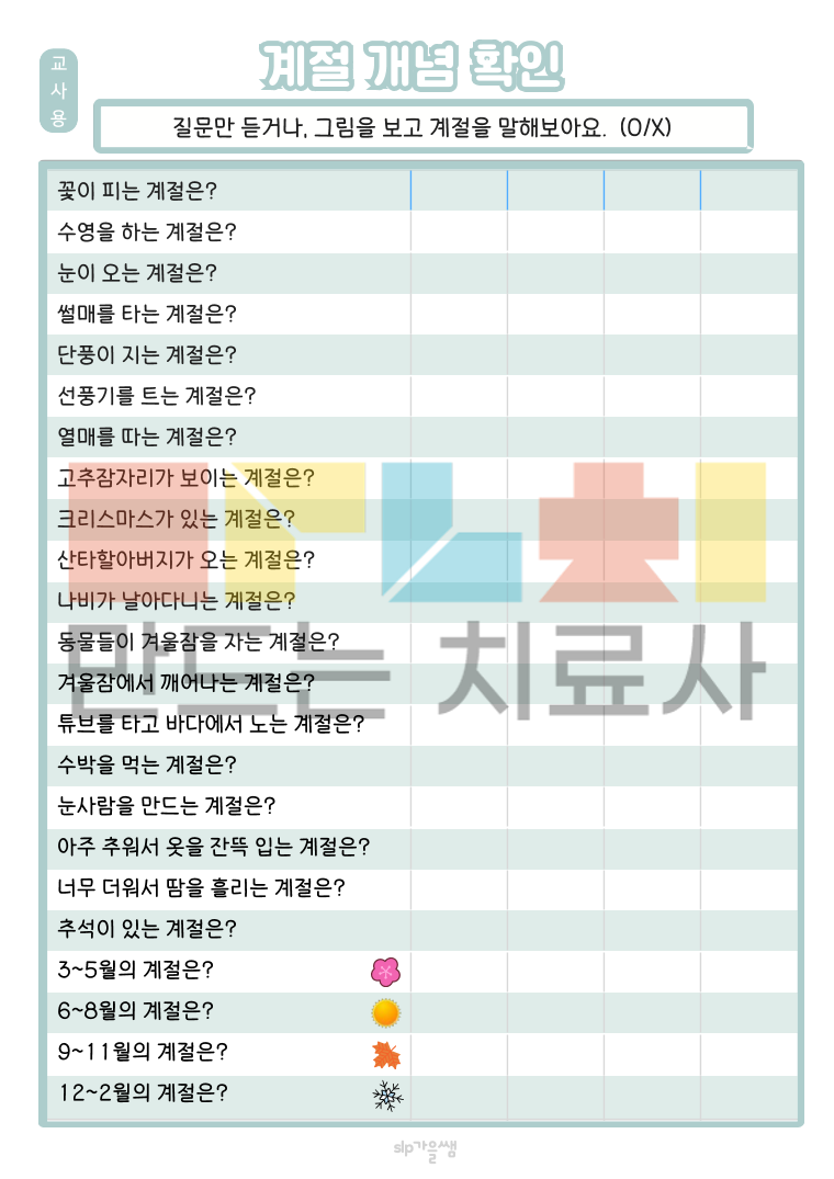 4~5세 : 날씨 개념 6~8세 : 계절 개념 날씨와 계절의 특징을 이해하고, 설명해보아요 각 날씨와 게절에 필요한 물건과 옷을 찾아보아요 <학령기용 추가> 기상특보를 알아보고, 문제를 풀어보아요\ 1. 범주화 과제, 계절 기억놀이, 변별퀴즈 2. 오늘의 날씨와 계절을 찾고, 해당하는 그림을 모두 찾아보아요 3. 읽기 자료를 읽고 문제를 함께 풀어보아요