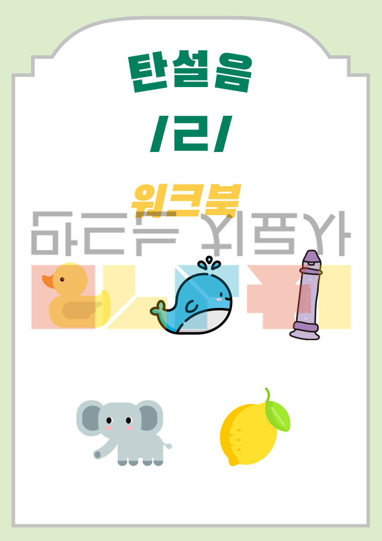 탄설음 /ㄹ/ 조음 연습 워크북입니다. 빠른이름대기, 다른 것 찾기, 듣고 색칠하기 활동으로 구성되어 있습니다. 빠른이름대기 - 색+이름 명명하기 다른 것 찾기 - 색+이름+달라요(ex. 초록 오리 달라요.) 색칠하기 - 색+이름("노란 오리" or "초록색으로 카메라 색칠해요.") 시지각, 청각주의력 향상에도 도움이 되는 활동들로 구성해보았습니다.
