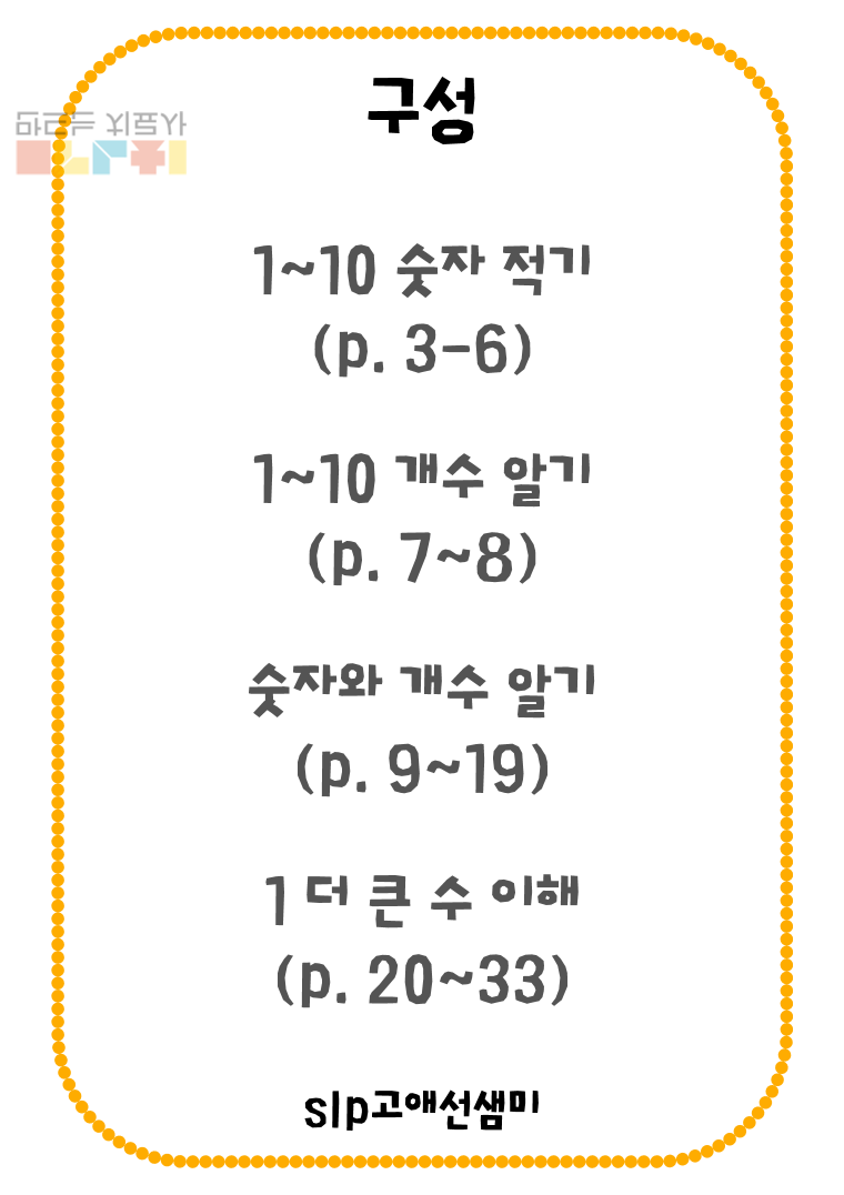1~10 까지의 수 개념 이해 향상을 위한 다양한 활동으로 구성되어 있습니다.