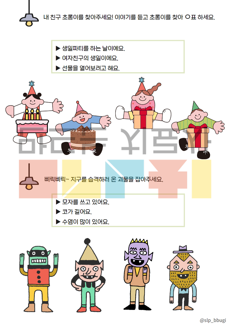 안녕하세요! 잘잘잘 시리즈 2입니다. 이번 자료는 제시된 그림의 순서를 기억해서 미로 찾기, 그림자 찾기, 보고 찾아보기를 통한 시/청각 주의력을 도울 수 있고 선생님이 들려주는 3가지 단서를 듣고 정답을 찾아보며 정보처리 능력 향상을 도울 수 있습니다. (총 38p) **잘잘잘 시리즈 1보다 난이도가 높은 과제들로 구성이 되어 있어 미리보기 페이지를 참고해 주시기 바랍니다. ** (*자료에 대해 문의할 내용이 있으시면 인스타그램 @slp_bbugi 로 언제든지 문의주세요.^^)