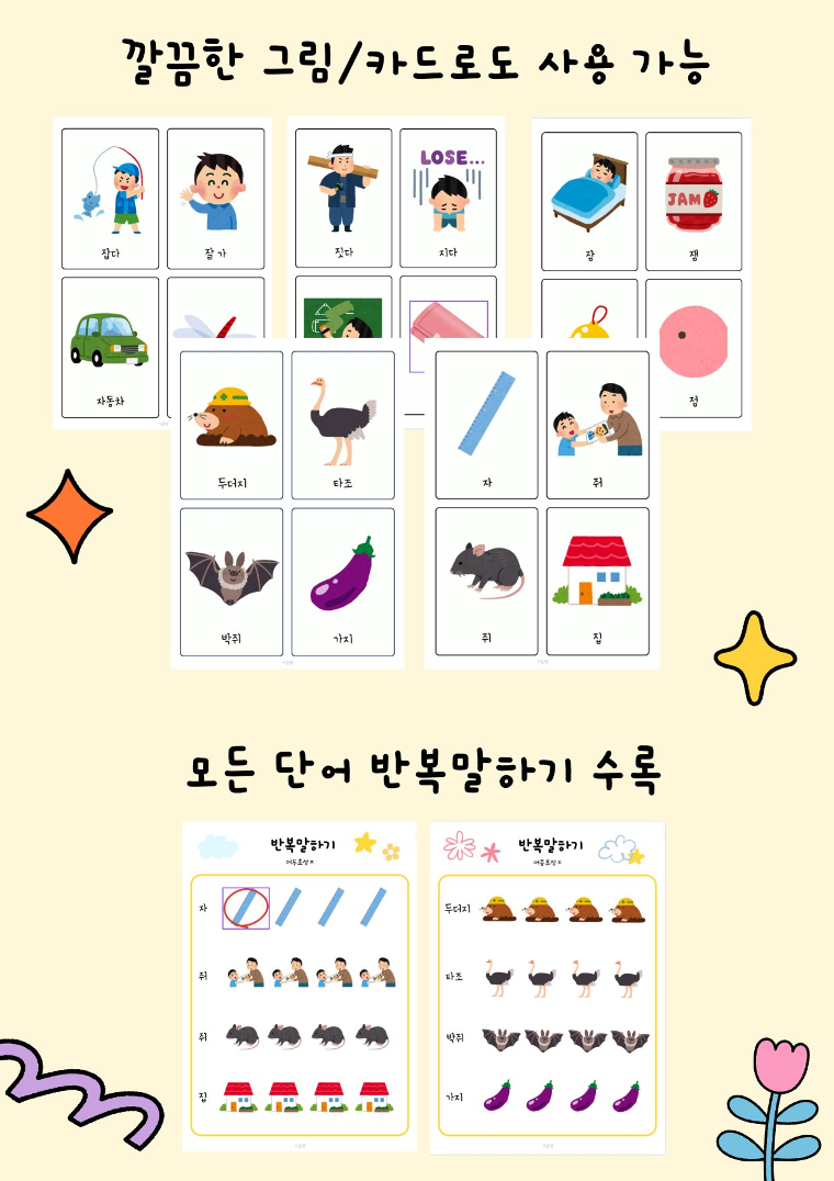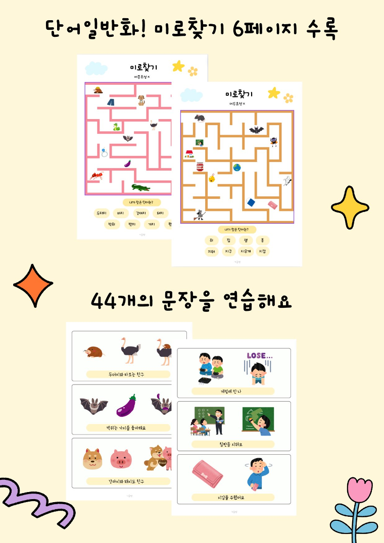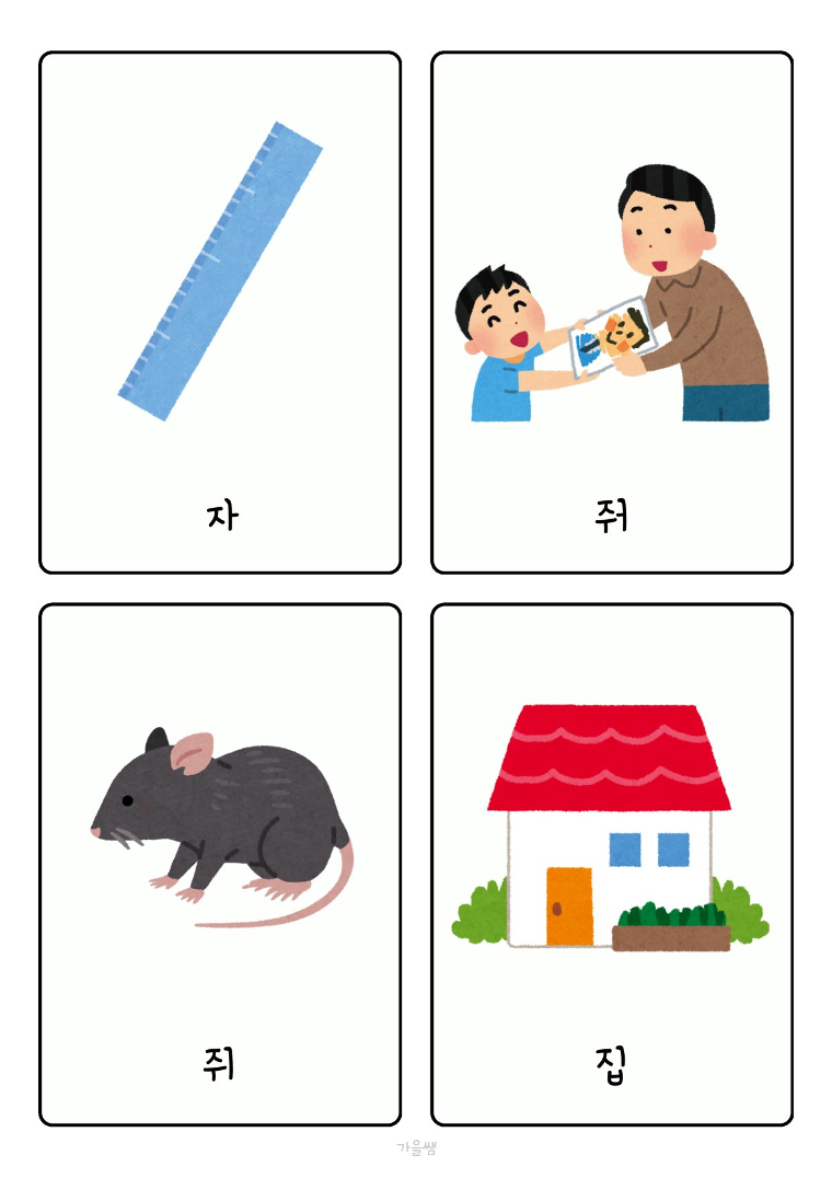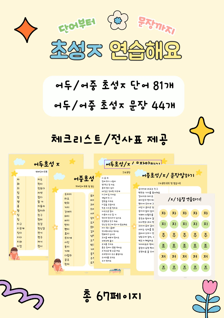초성 ㅈ을 음소, 단어, 문장 별로 연습해보아요. 81개의 단어와 배운 단어가 포함된 44개의 문장으로 구성되어 있습니다.