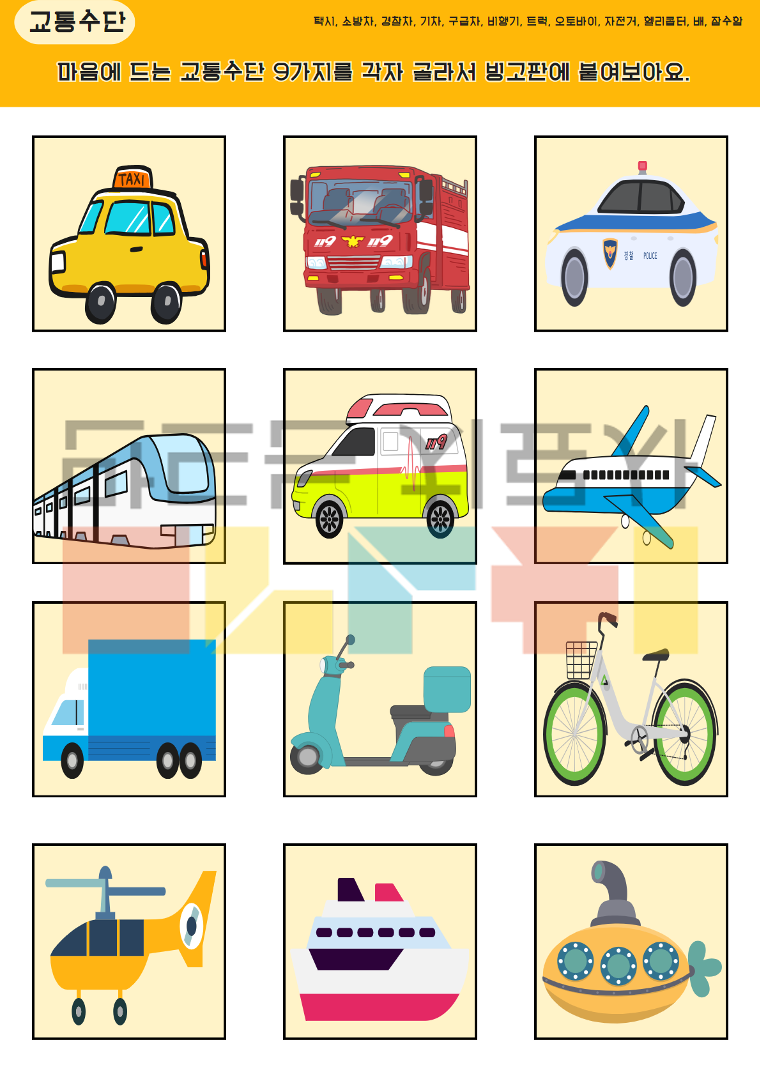 안녕하세요. 꼬북쌤입니다. 이번 자료는 빙고 게임을 통한 활동 자료입니다. (3X3) 빙고 게임은 가로, 세로, 사선으로 줄을 먼저 만드는 사람이 이기는 게임이에요. 아이들의 수학적, 언어적 능력을 향상시키는 데 도움이 되고 또래 친구와 게임을 통해 사회성을 향상시킬 수 있어요. 각 범주별 그림은 전체그림, 특정 부분이 가려진 부분 그림으로 나뉘어져 있기 때문에 가려진 그림이 무엇인지 생각해 보면서 시각 주의 능력 및 관찰 능력을 향상시킬 수 있답니다.