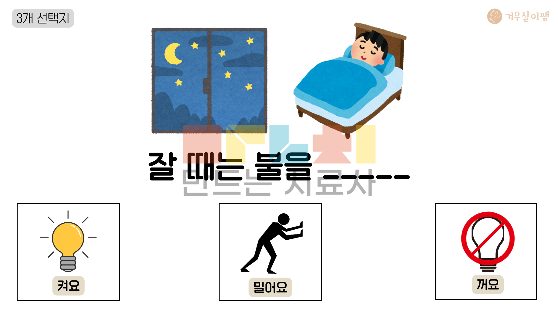 지난 반대어휘 선택하기 1, 2, 3에 이은 내용입니다. 1) 2~4가지 선택지가 있어 글자를 모르는 친구들도 선택할 수 있게 하였으며 2) 글자를 아는 친구들은 위의 선택지를 보고 쓰기/읽기를 통해 반대어휘를 습득할 수 있도록 구성하였습니다.