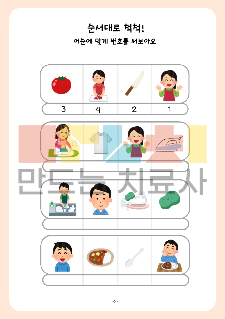 <4문으로 말해요> 누가 무엇으로 무엇을 -해요 두구격 조사를 사용한 4어문 문장 학습하기! 𖤐세트𖤐 1.도구격 조사를 사용한 문장 표현 학습하기 2. 문장 순서에 맞게 그림 아래에 번호 적기 3. 어순에 맞게 글로 쓰며 문장 완성하기 𖤐 44개 문장 수록 / 4개 문장씩 II 세트로 구성되어 있습니다 :)