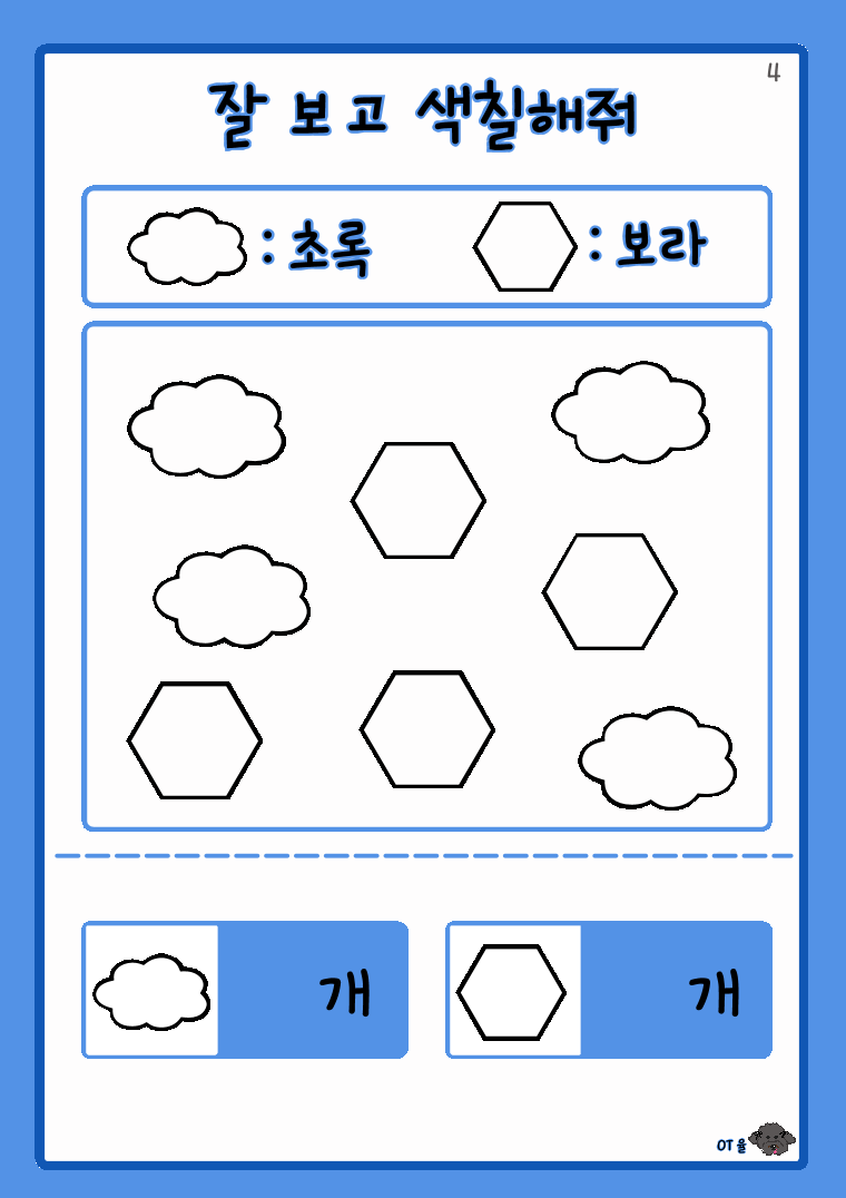 *구성 총 10p, PDF 파일 *설명 각 도형마다 지정된 색상을 그림을 보고 알맞게 색칠하고, 개수를 세어보세요.