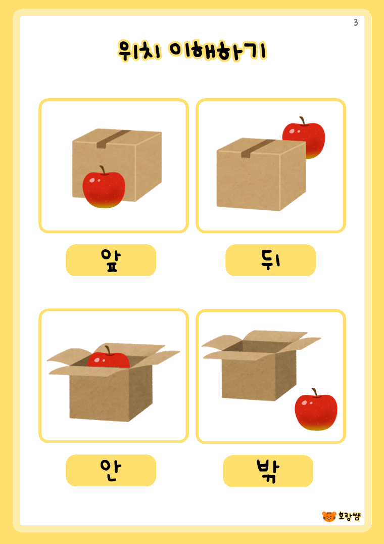 위치를 쉽게 배워요 2 (위,아래/왼쪽,오른쪽/ 안,밖/앞,뒤) *3가지 선택지에서 고르기 *위치 인지 *위치 어휘 학습 *공간 이해 그림을 보고 위치를 배운 후 문제를 보고 같은 위치를 골라봐요.