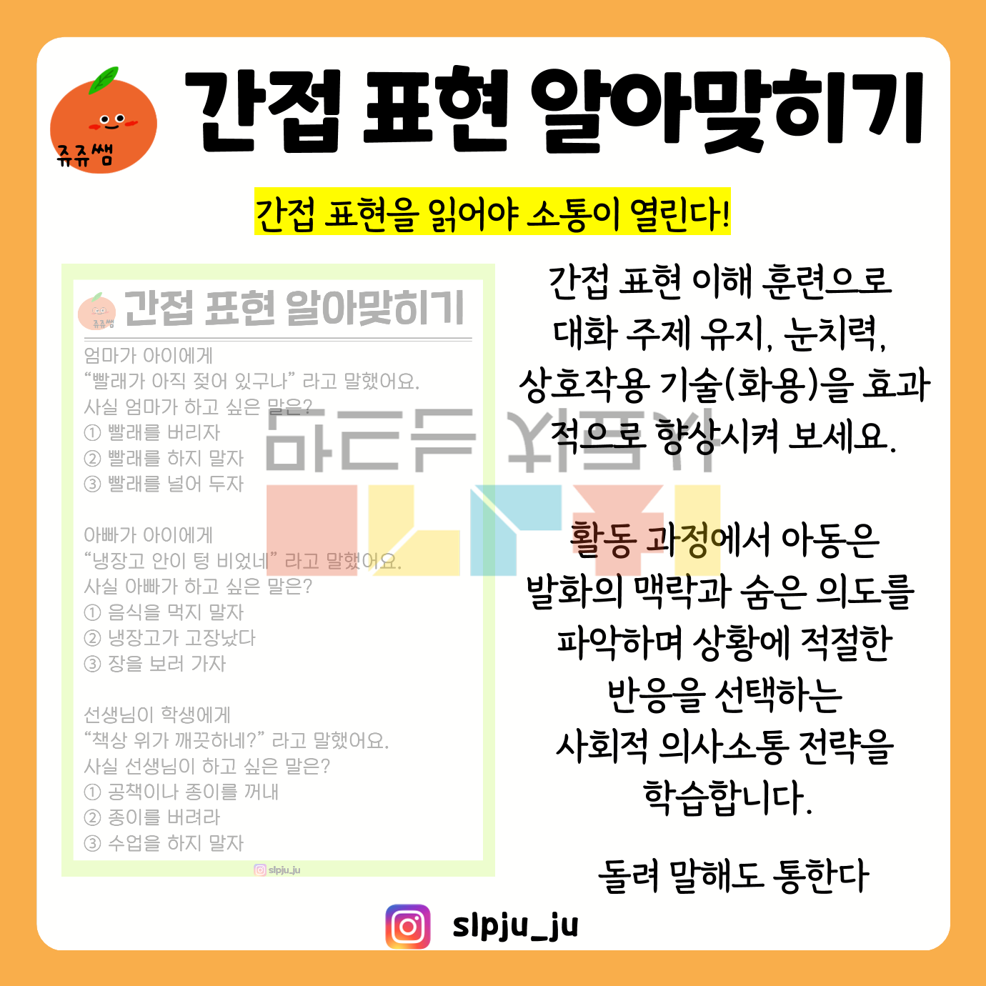 안녕하세요 쥬쥬쌤입니다. 간접 표현을 읽어야 소통이 열린다. 간접 표현 이해 훈련으로 대화 주제 유지, 눈치력, 상호작용 기술(화용)을 효과적으로 향상시켜 보세요. 활동 과정에서 아동은 발화의 맥락과 숨은 의도를 파악하며 상황에 적절한 반응을 선택하는 사회적 의사소통 전략을 학습합니다.